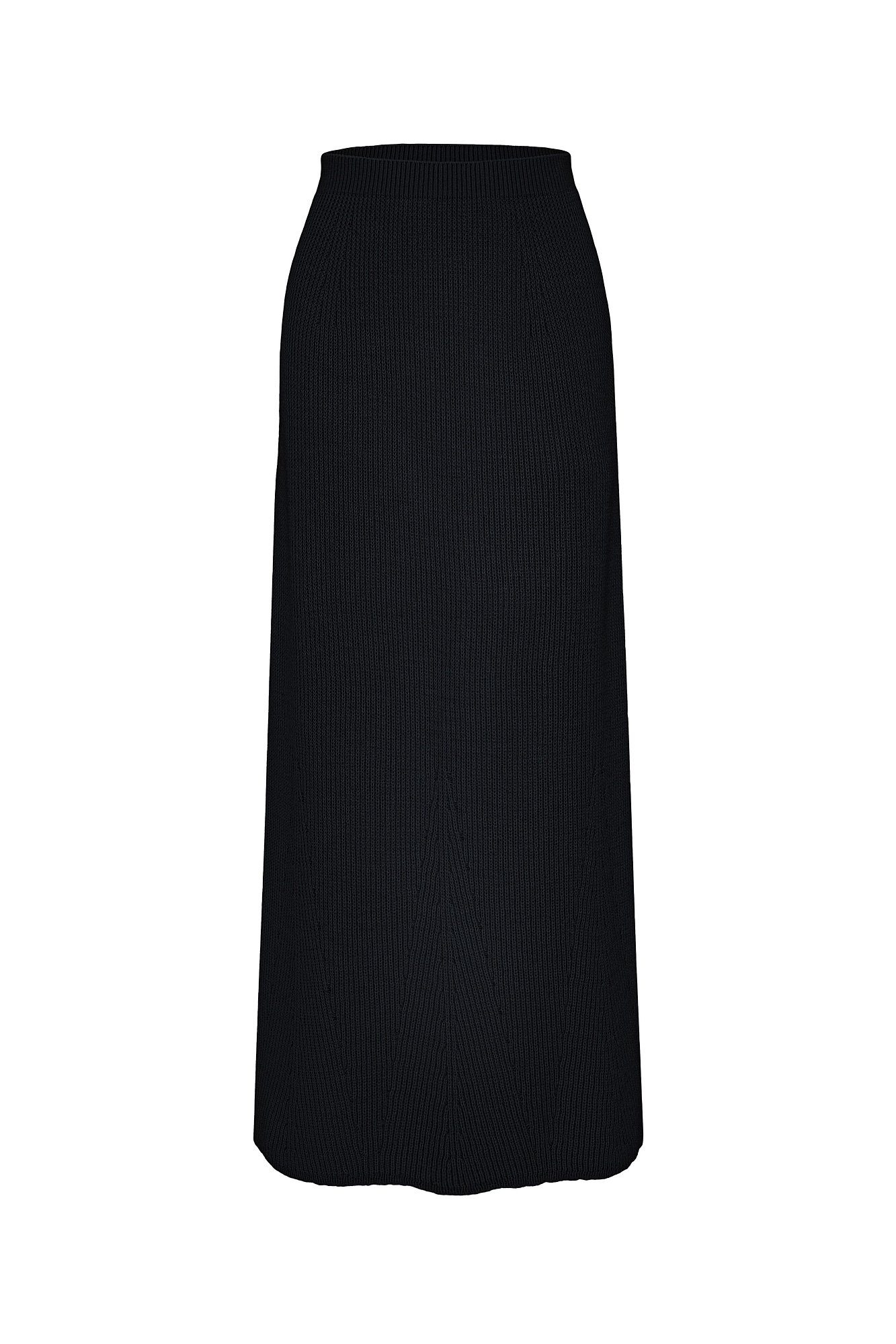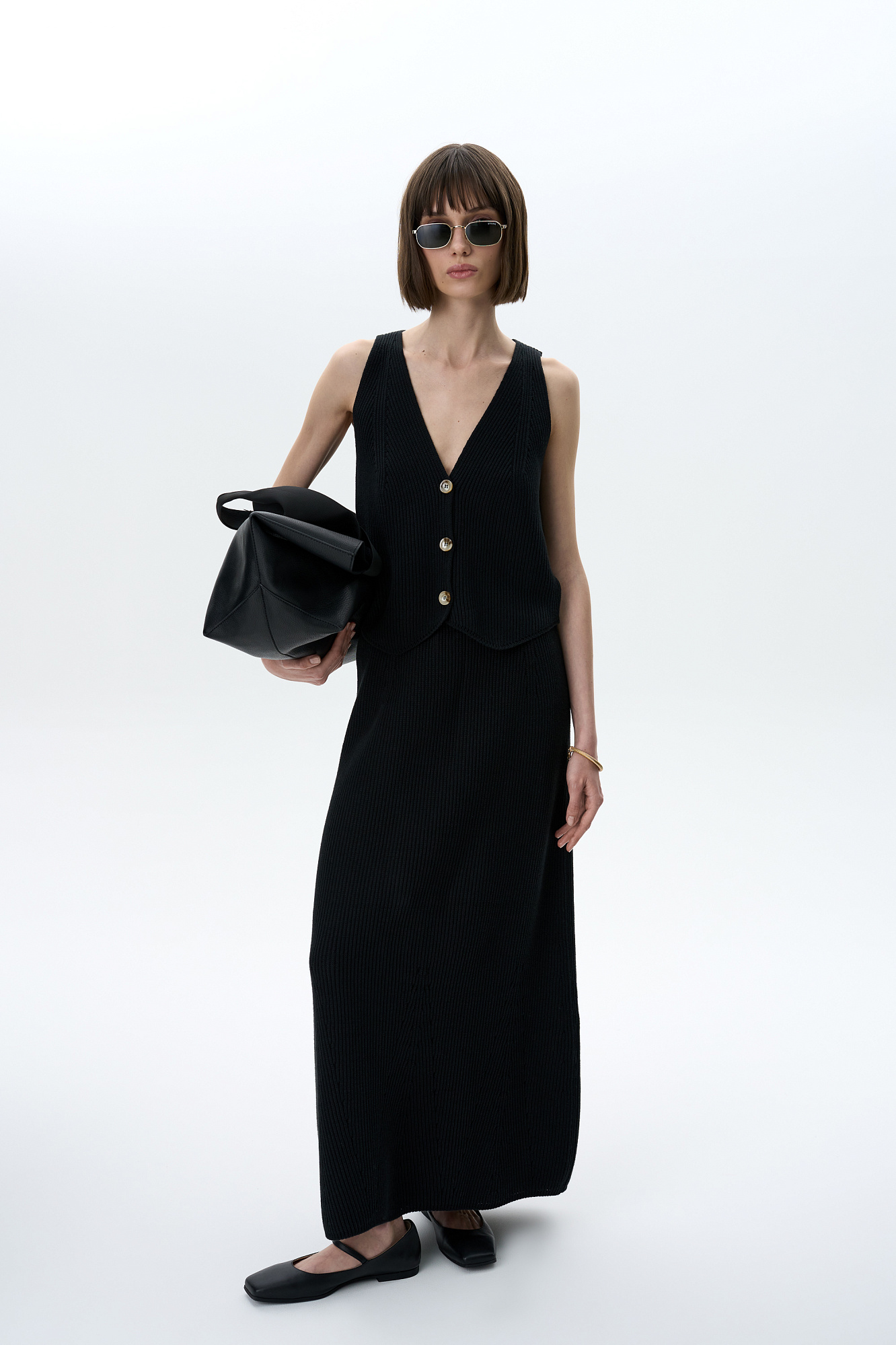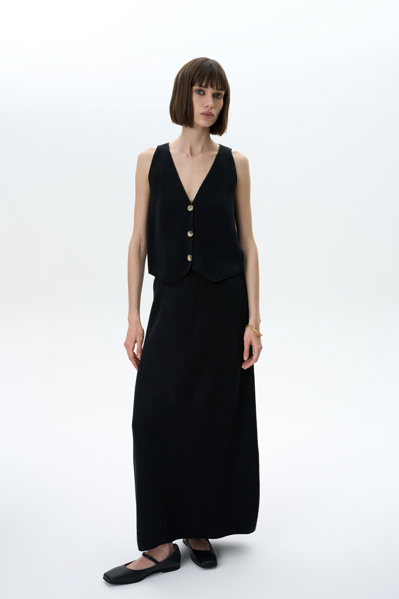 Трикотажная юбка длины макси из хлопка с добавлением вискозы. Модель свободного силуэта с эластичным поясом в рубчик. Дополнить образ можно жилетом в таком же стиле.