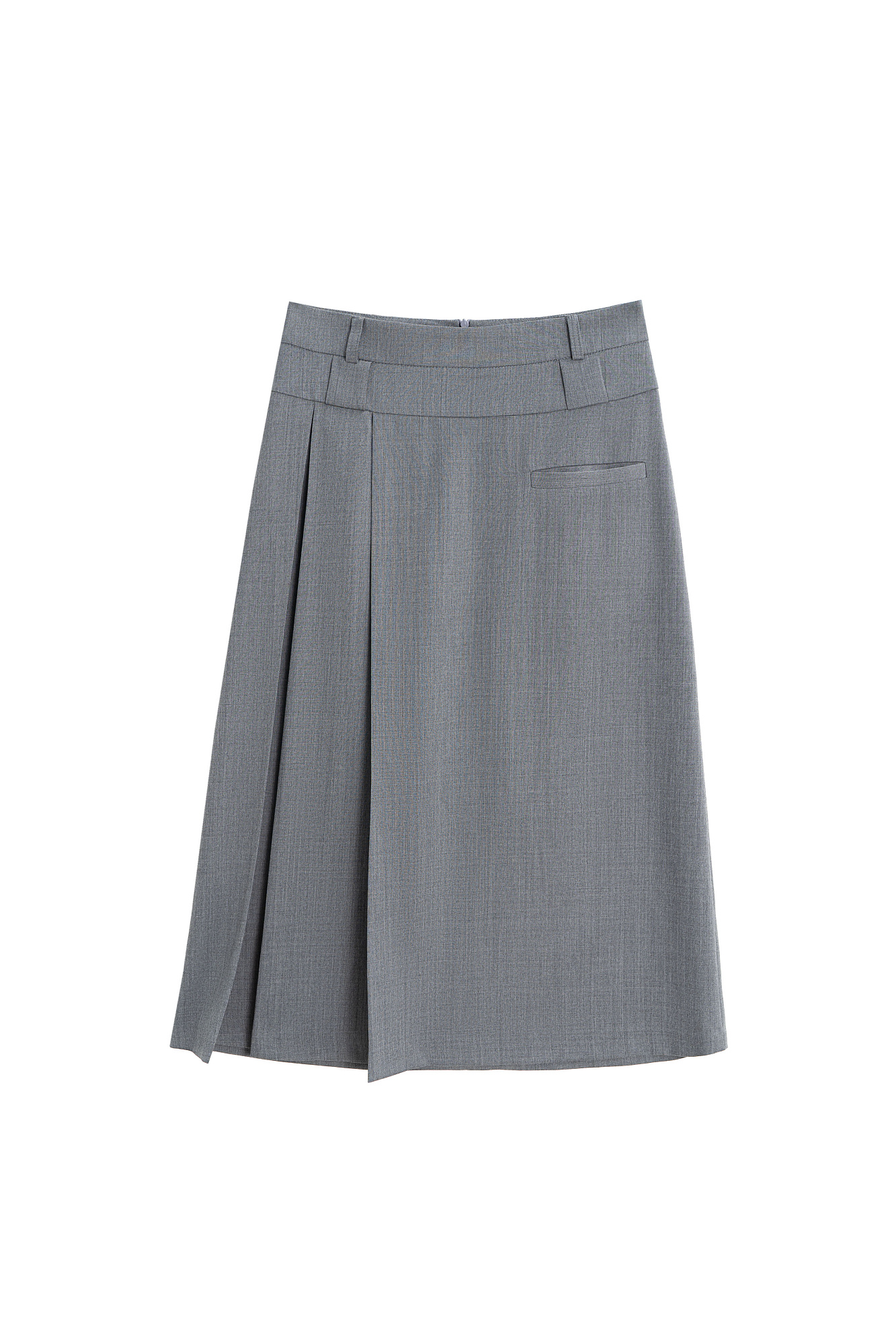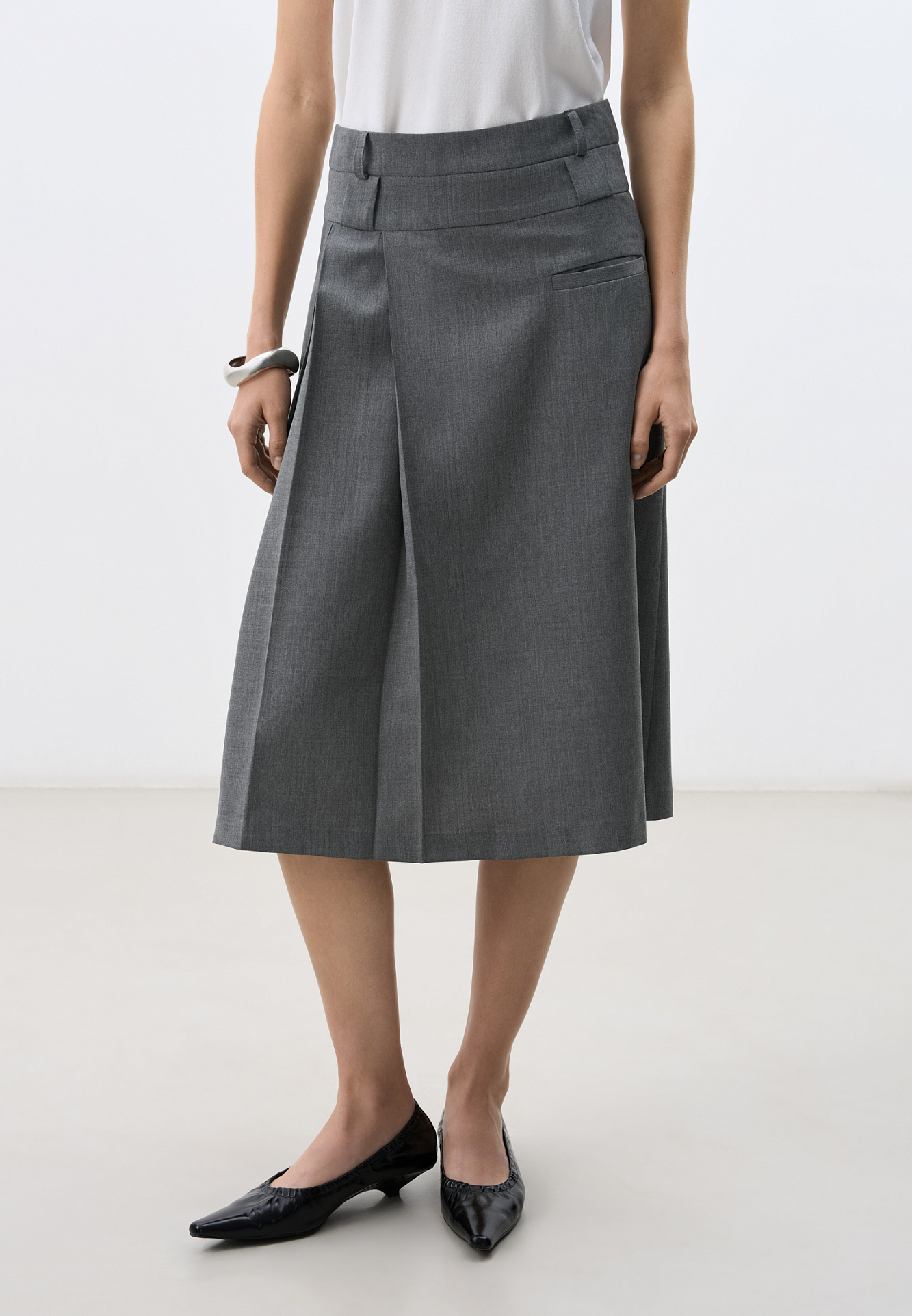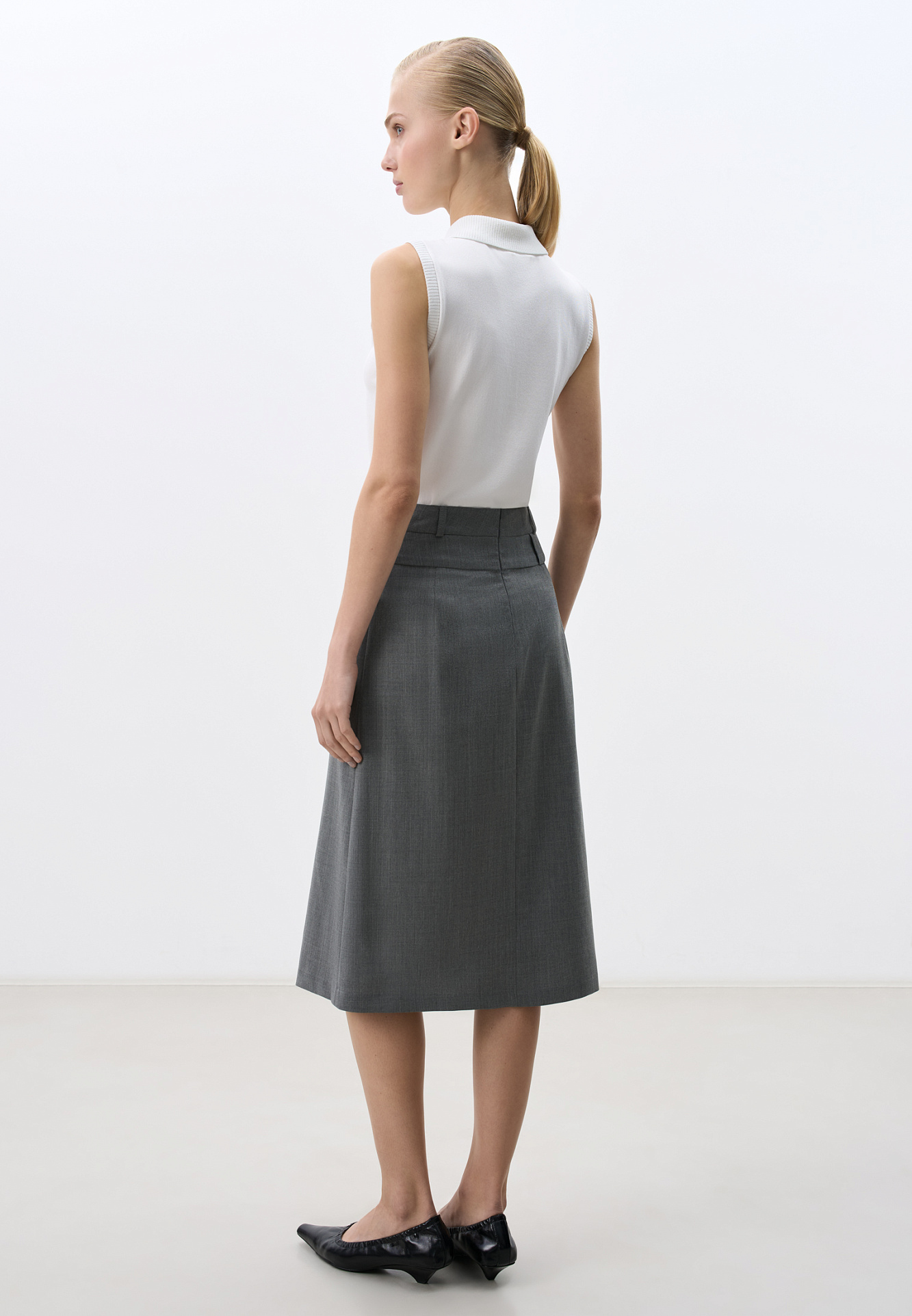 Юбка длины миди из шерсти. Модель прямого кроя, с двумя продольными складками сбоку, двойным поясом со шлевками для ремня, врезным карманом и застежкой на молнию. Изделие без подкладки.