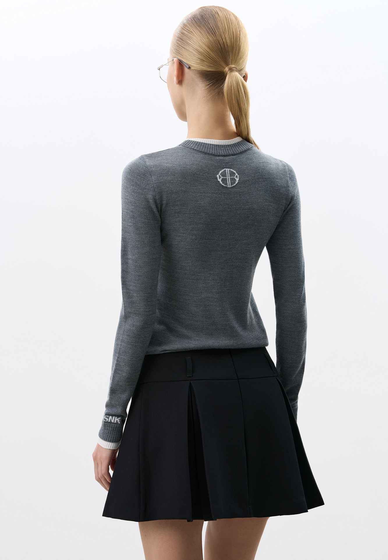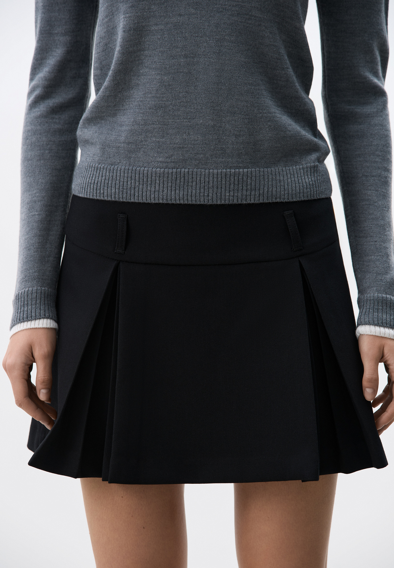 Юбка длины мини из поливискозы. Модель с высоким поясом, дополненым шлевками для ремня. Изделие декорировано закрытыми веерными складками. Застежка на молнию.