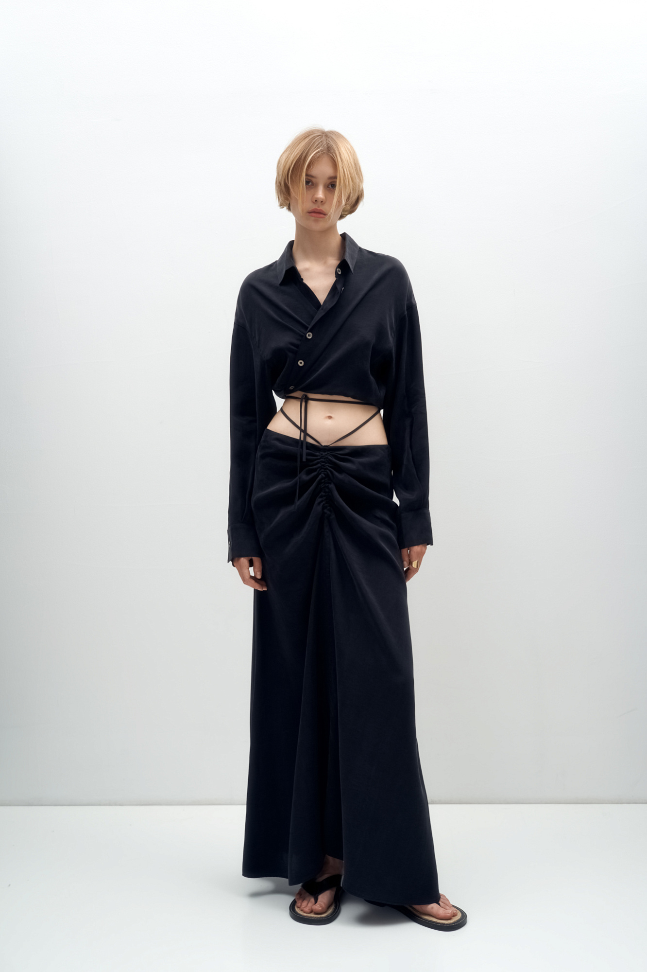 Юбка из 100% купры с драппировкой и кулиской по середине. Дополнить образ можно рубашкой из такого же материала.