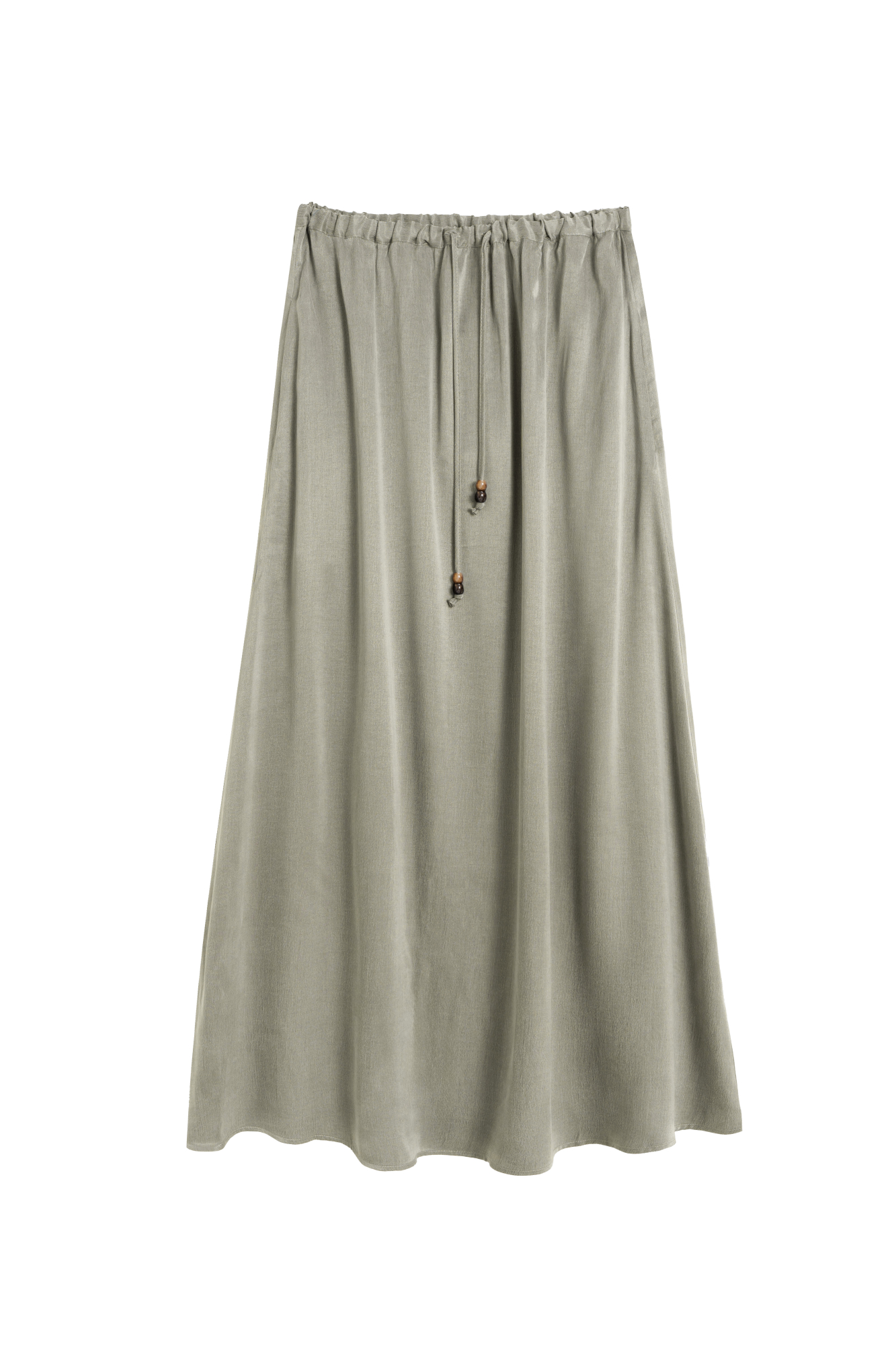 Юбка длины макси из купры. Модель свободного силуэта на кулиске с поясом, декорированным бусинами.