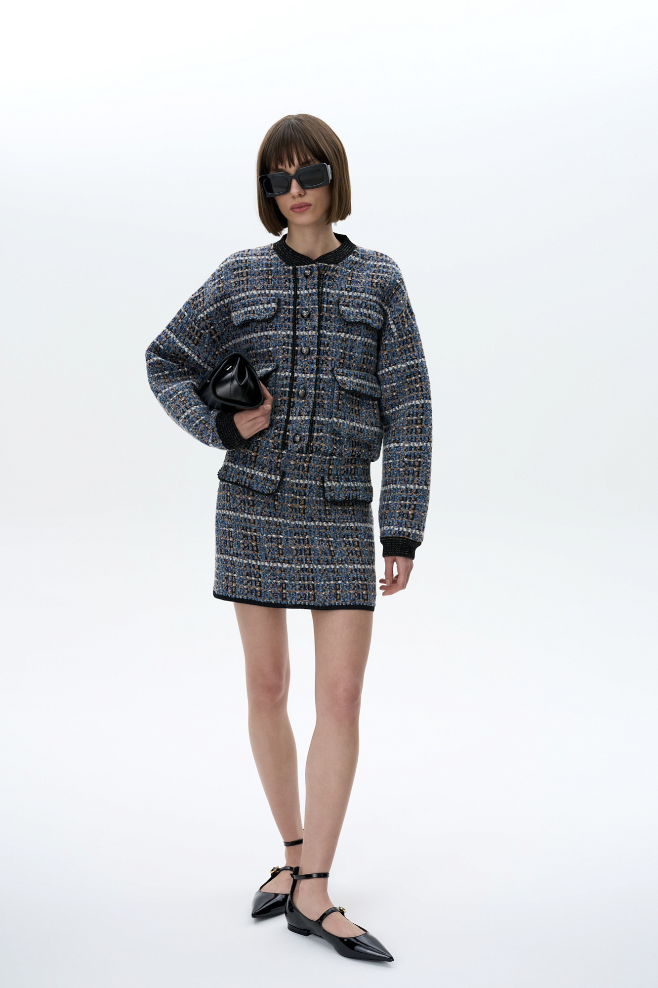 Трикотажна юбка длины мини. Модель классического силуэта выполнена из фактурного твида с имитацией накладных карманов и застежкой на молнию.