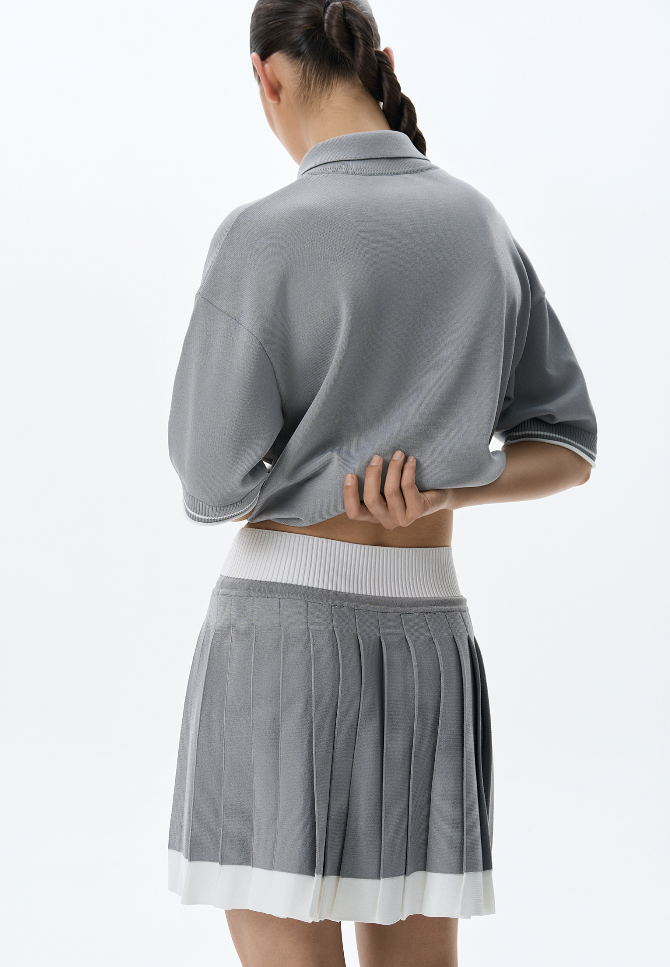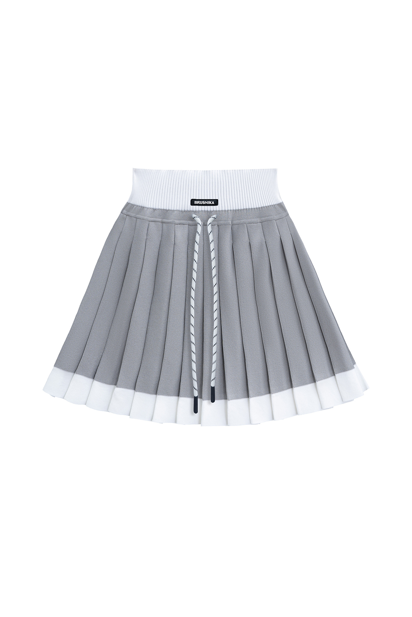 Трикотажная юбка плиссе длины мини из вискозы. Модель с широким эластичным поясом в рубчик. Пояс и нижняя часть юбки выполнены из пряжи контрастного цвета.