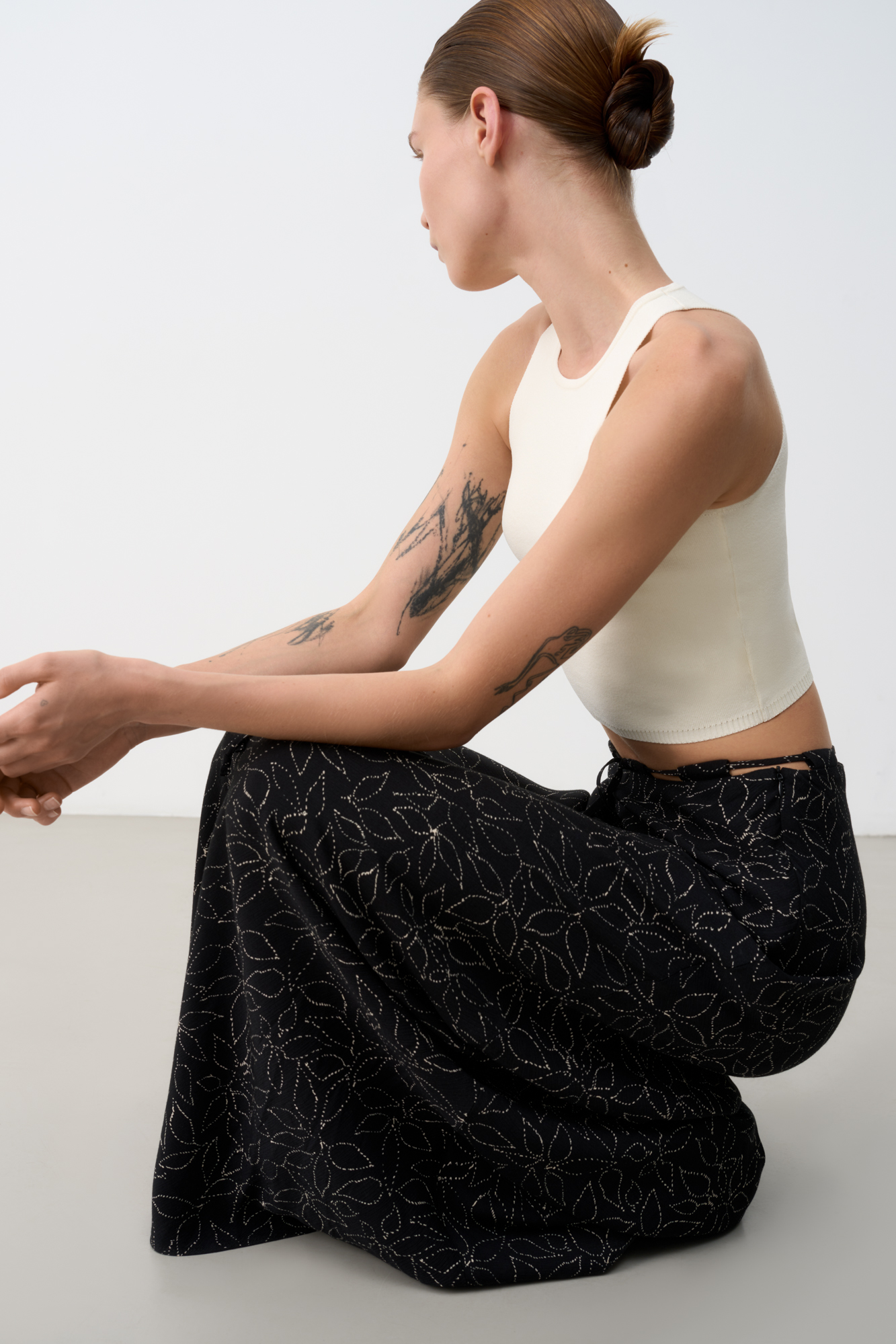 Принтованная юбка макси. Модель приталенного силуэта с регулируемой кулиской на поясе.