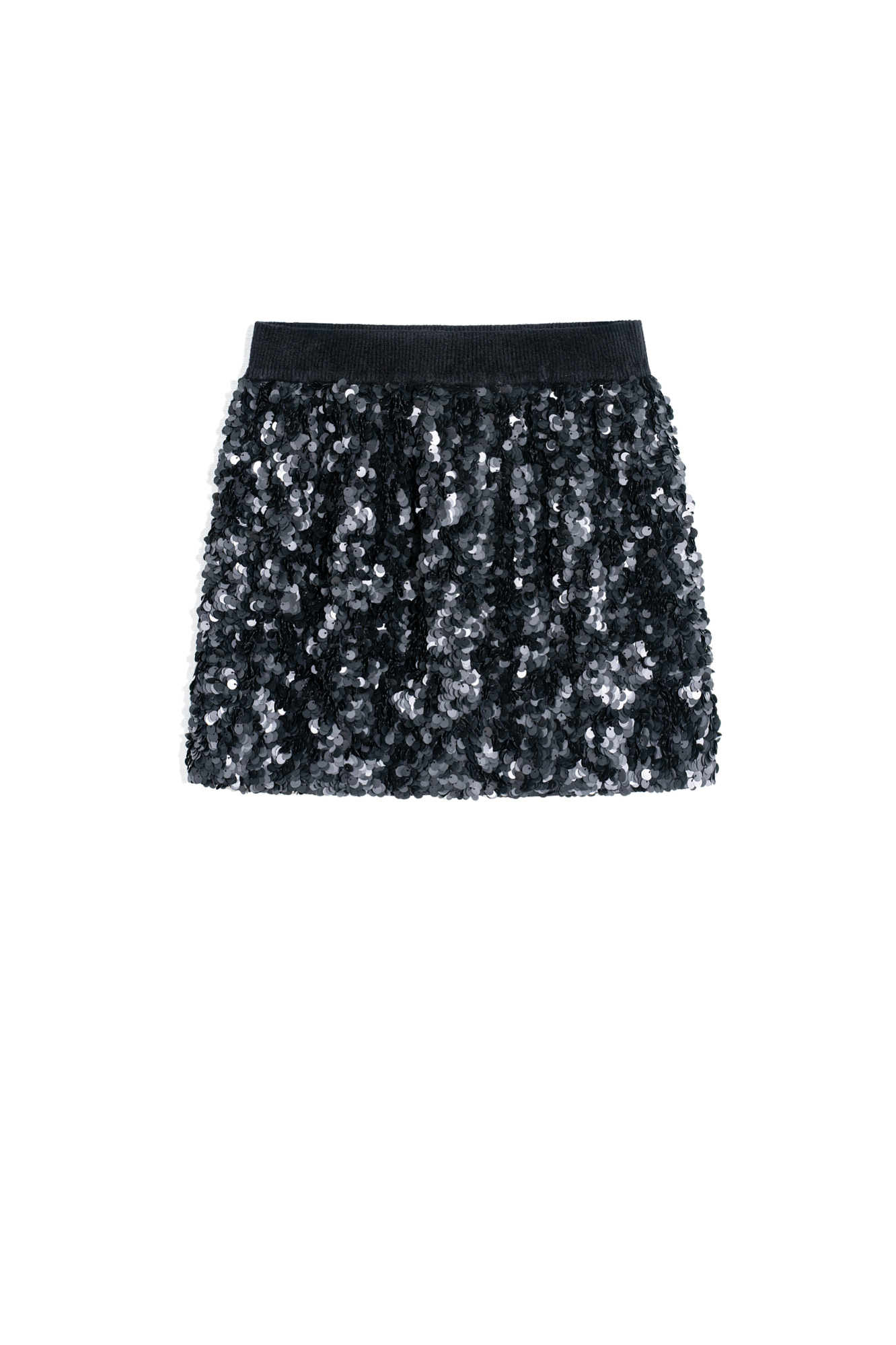 Юбка длины мини, расшитая матовыми пайетками. Модель прямого кроя, с эластичным поясом в рубчик. Изделие на подкладке.