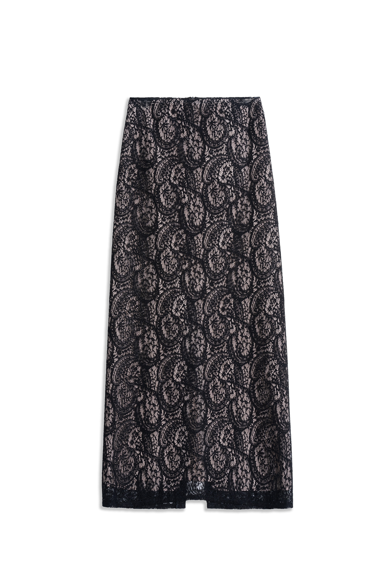 Юбка длины миди, выполненная из кружева на подкладке контрастного цвета. Модель прямого силуэта, с разрезом сзади и застежкой на молнию.