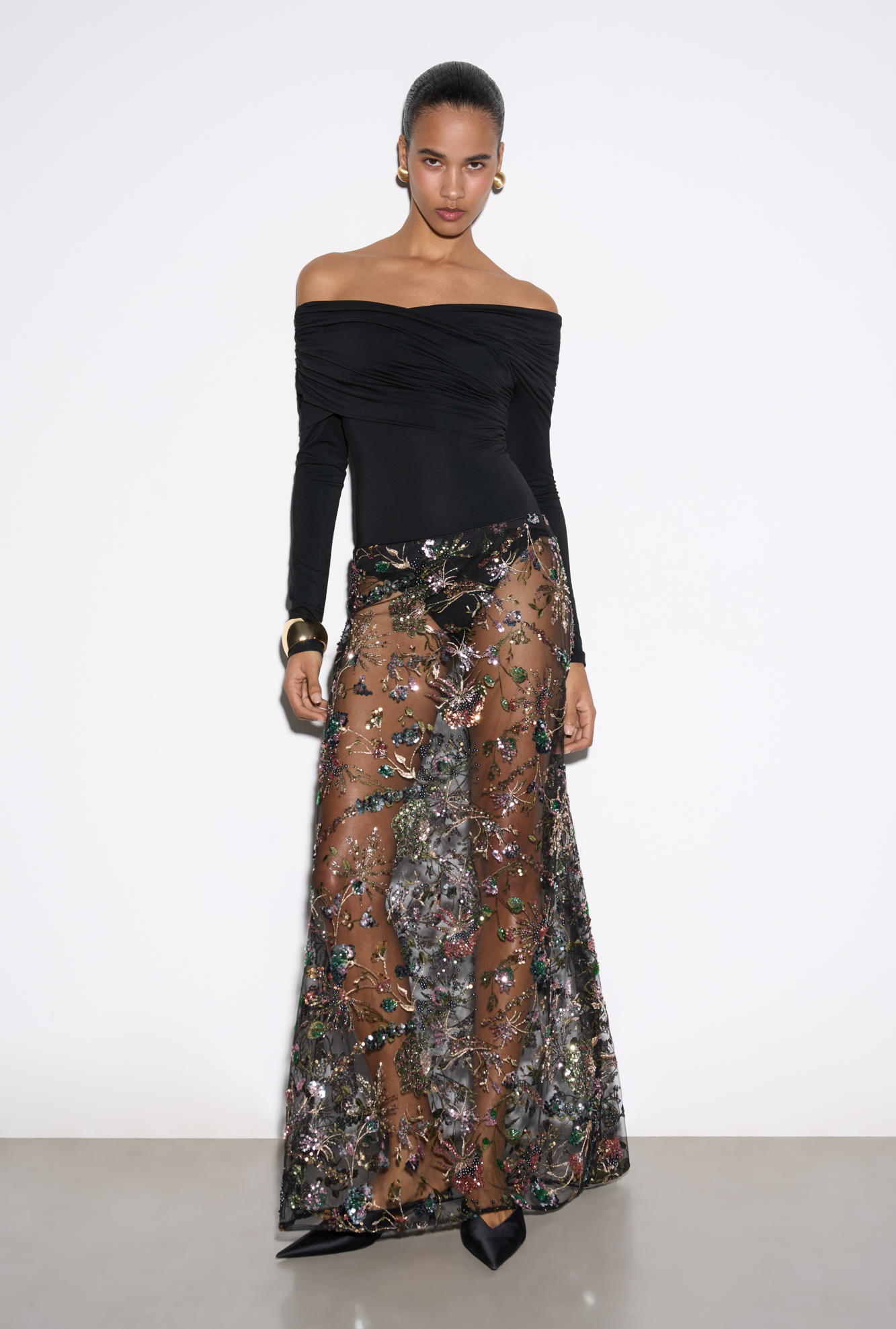 Юбка длины макси с цветочным орнаментом, вышитым пайетками и бисером. Застежка на потайную молнию. Изделие без подкладки.