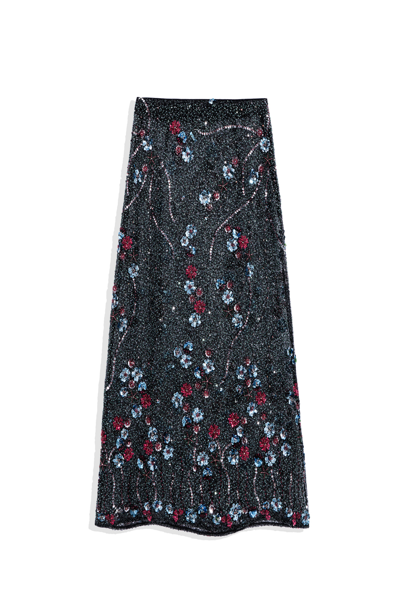 Юбка длины макси с цветочным орнаментом, вышитым пайетками и бисером. Застежка на потайную молнию. Изделие без подкладки.