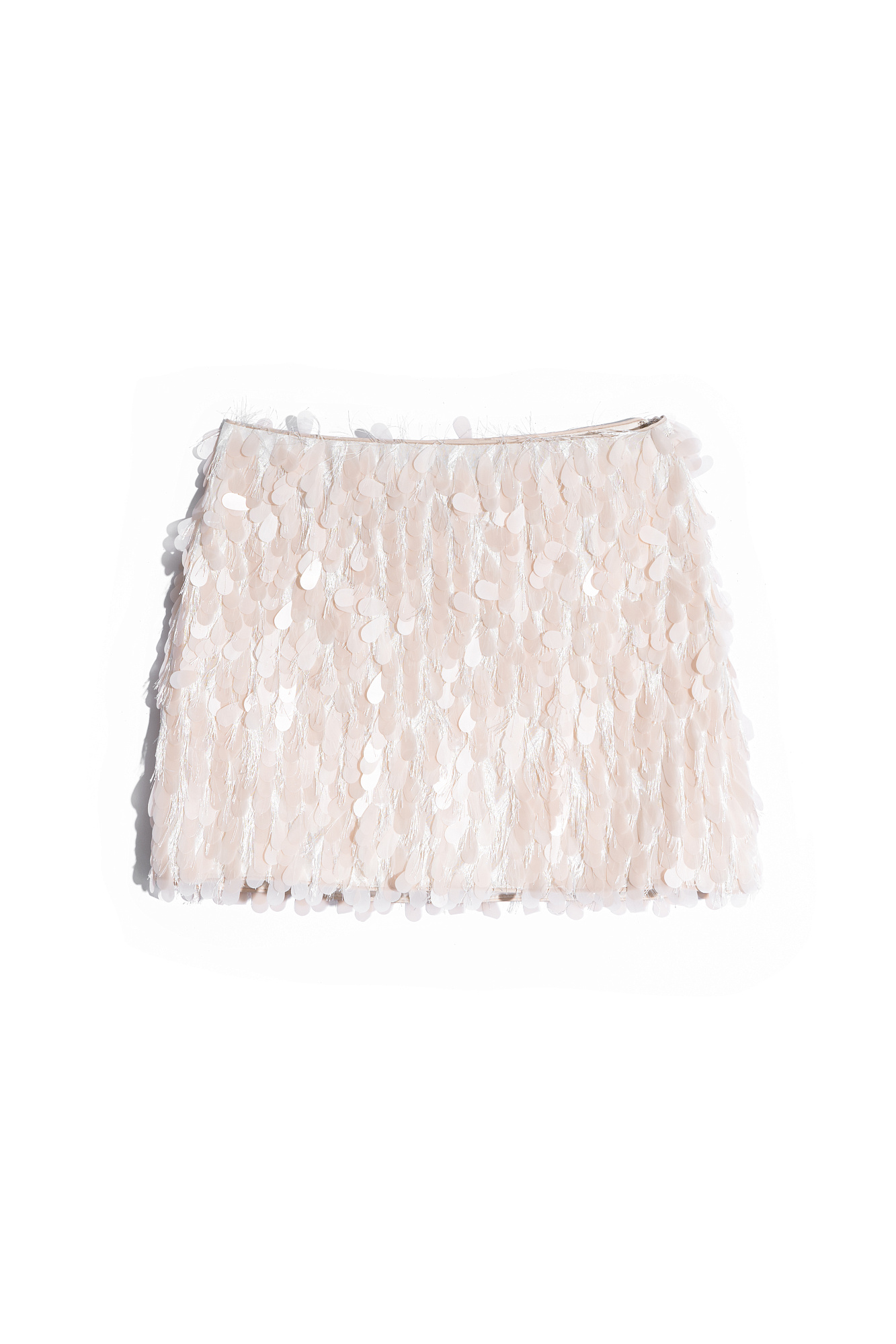 Вечерняя юбка длины мини, декорированная крупными пайетками и бахромой. Изделие выполнено на подкладке. Застежка сбоку на молнию и скрытый крючок.