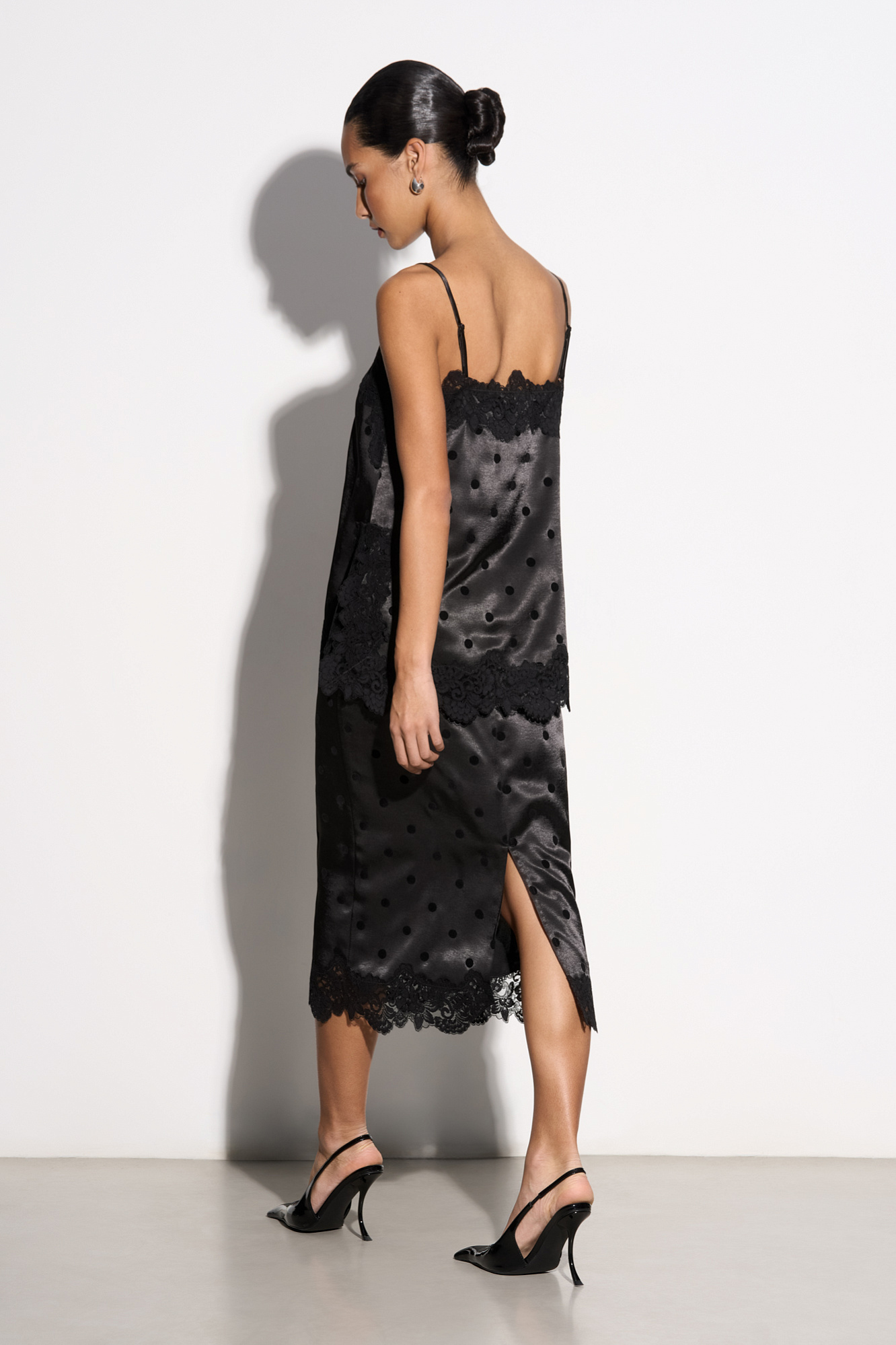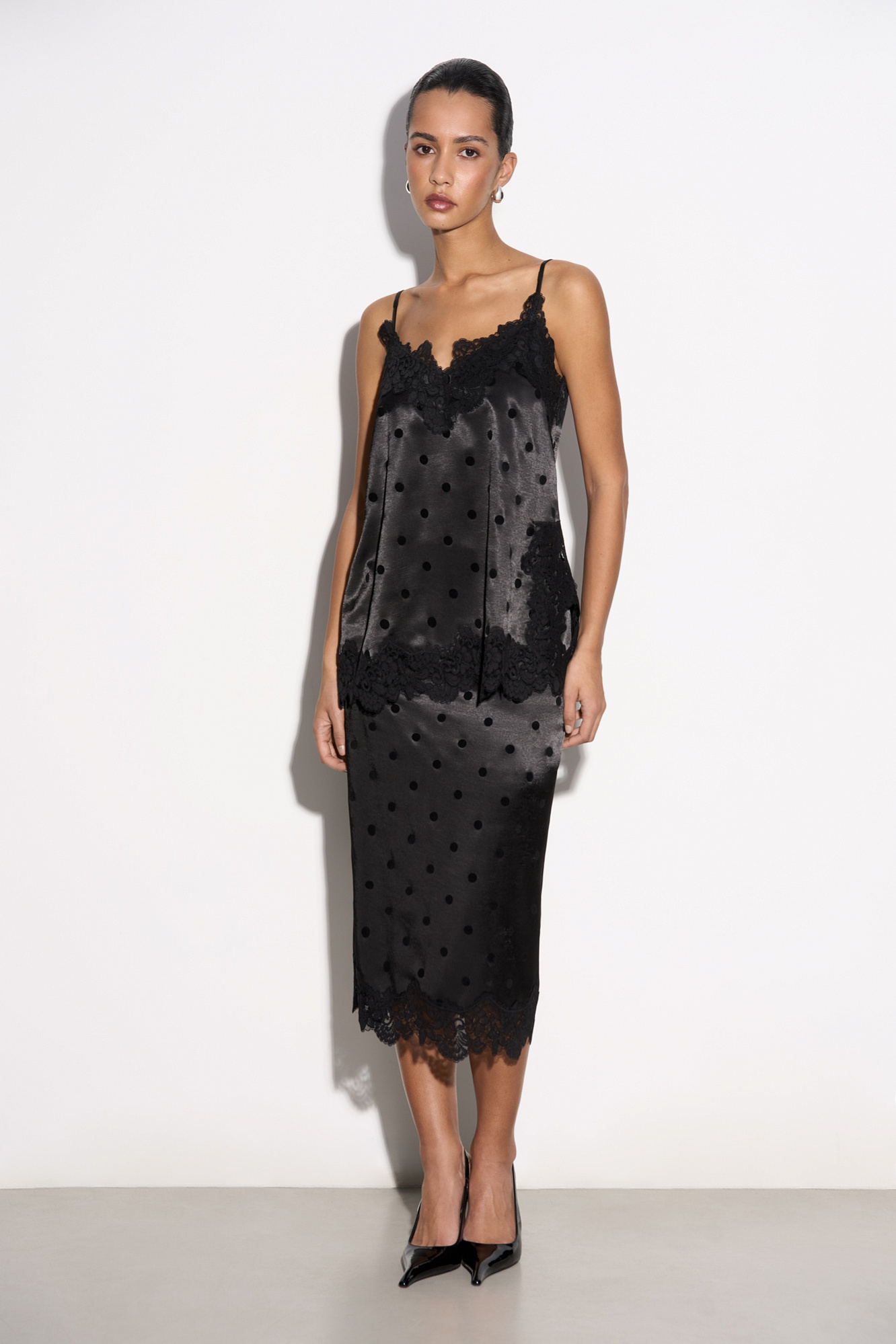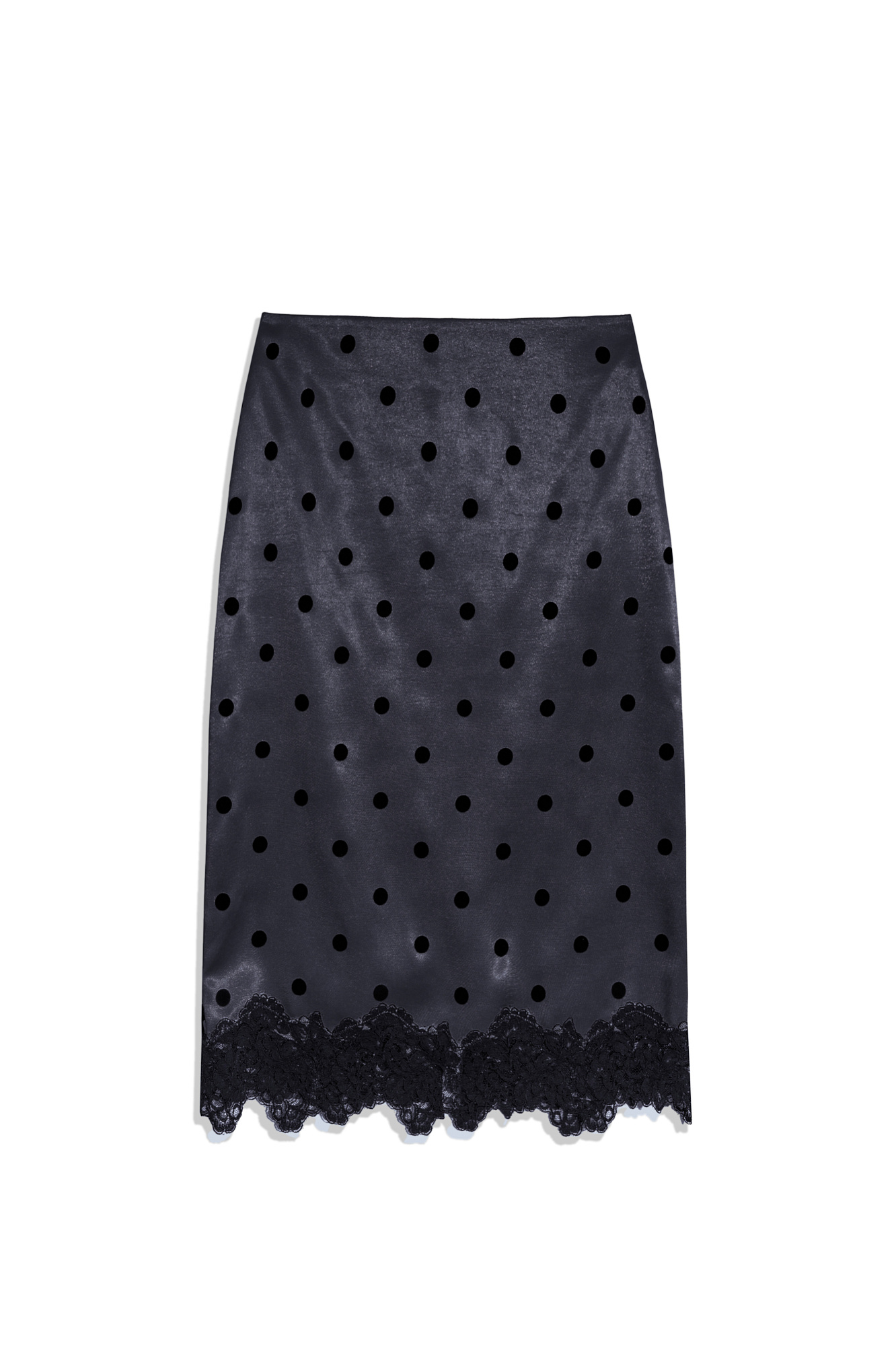 Атласная юбка в горох длины миди. Модель по фигуре с застежкой на потайную молнию. Подол изделия декорирован кружевом.