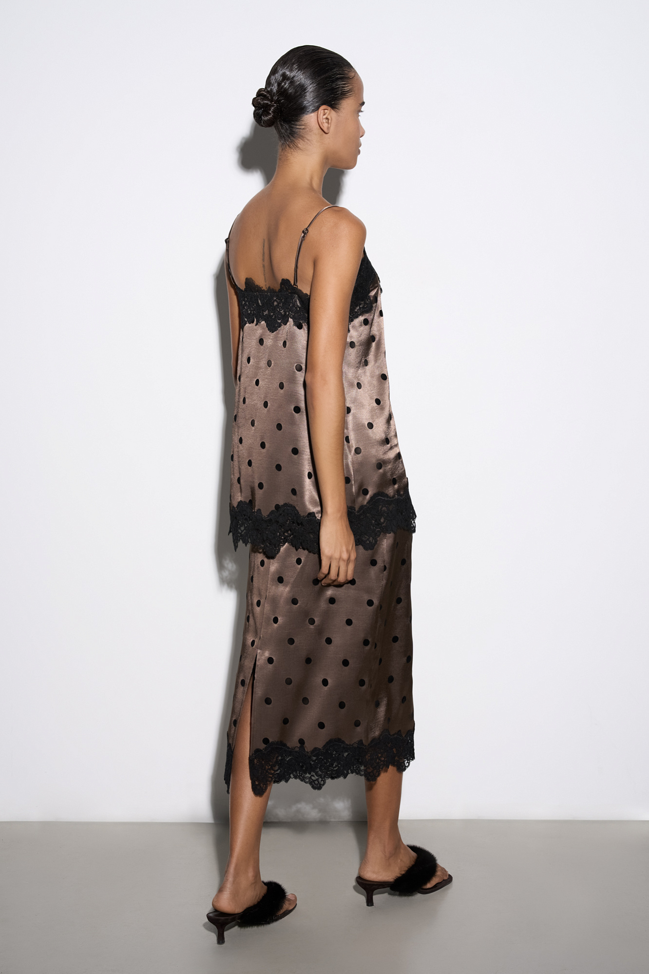 Атласная юбка в горох длины миди. Модель по фигуре с застежкой на потайную молнию. Подол изделия декорирован кружевом.