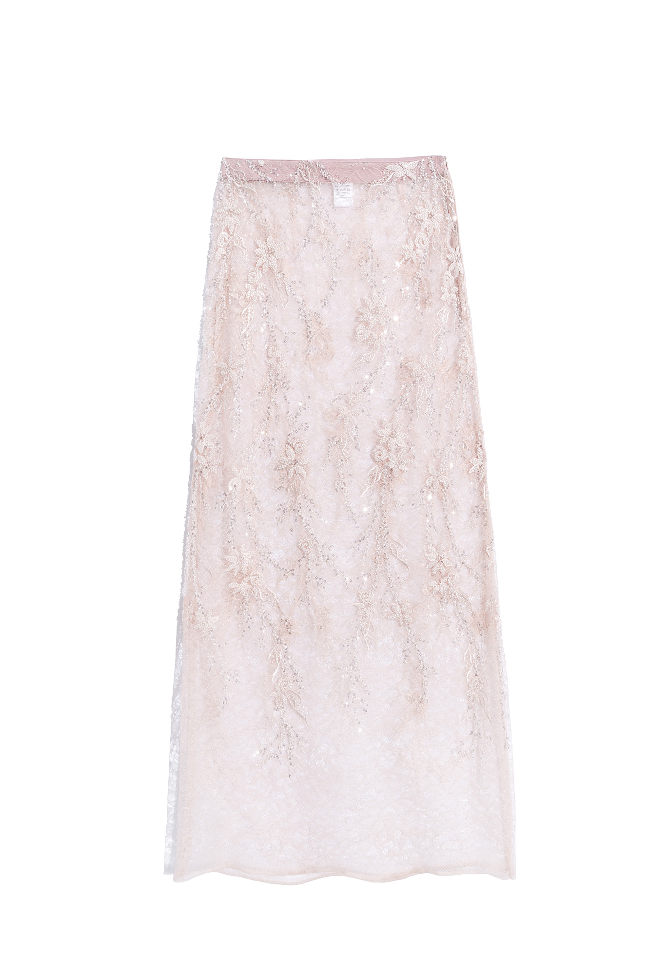 Кружевная юбка длины макси с цветочным орнаментом, расшитая бисером и пайетками. Застежка на потайную молнию. Изделие выполнено без подкладки.