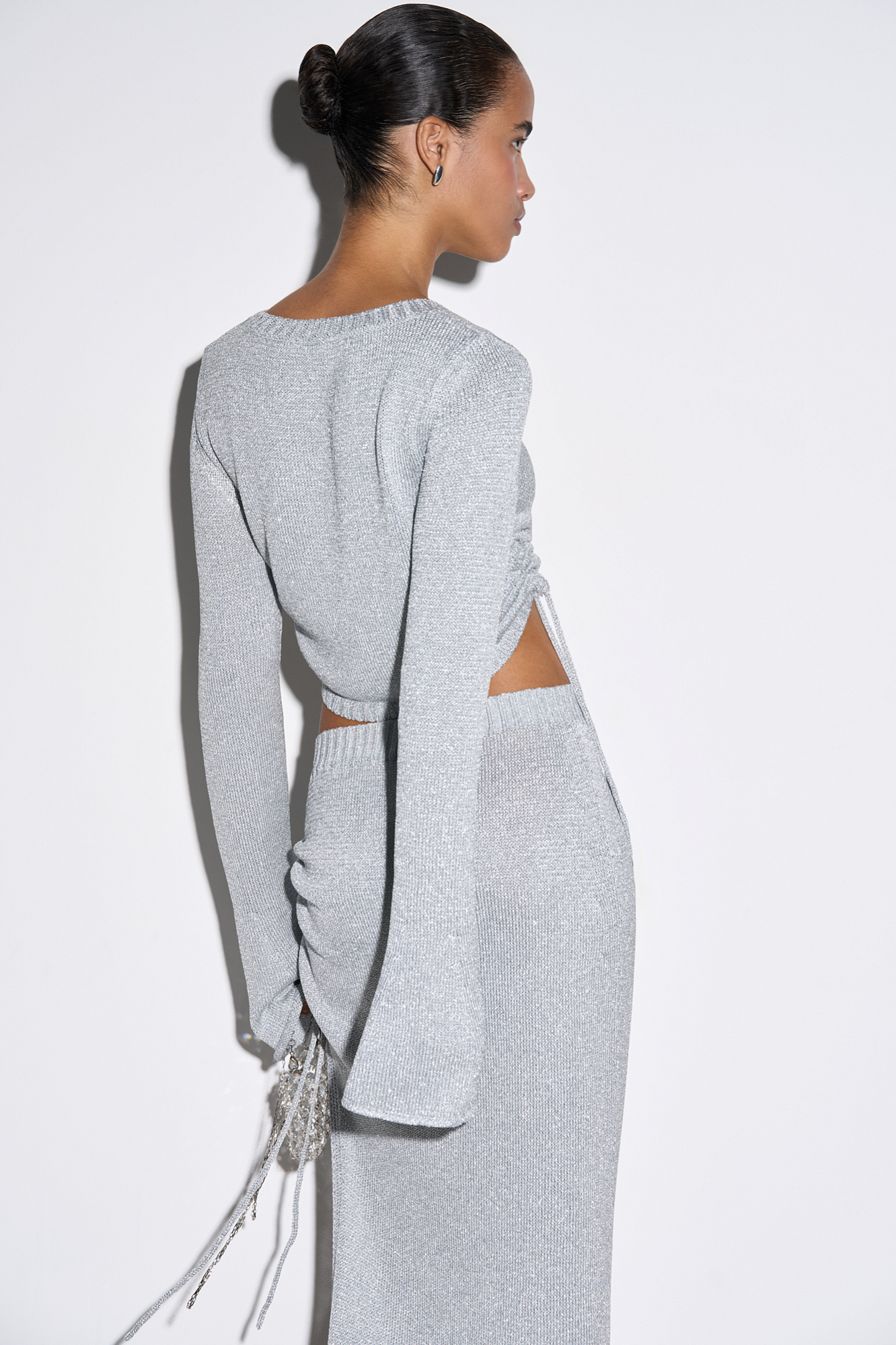 Трикотажная юбка длины макси из вискозы с люрексом. Модель облегающего силуэта, с эластичным поясом в рубчик и разрезом от бедра с кулиской. Дополнить образ можно топом в таком же стиле.