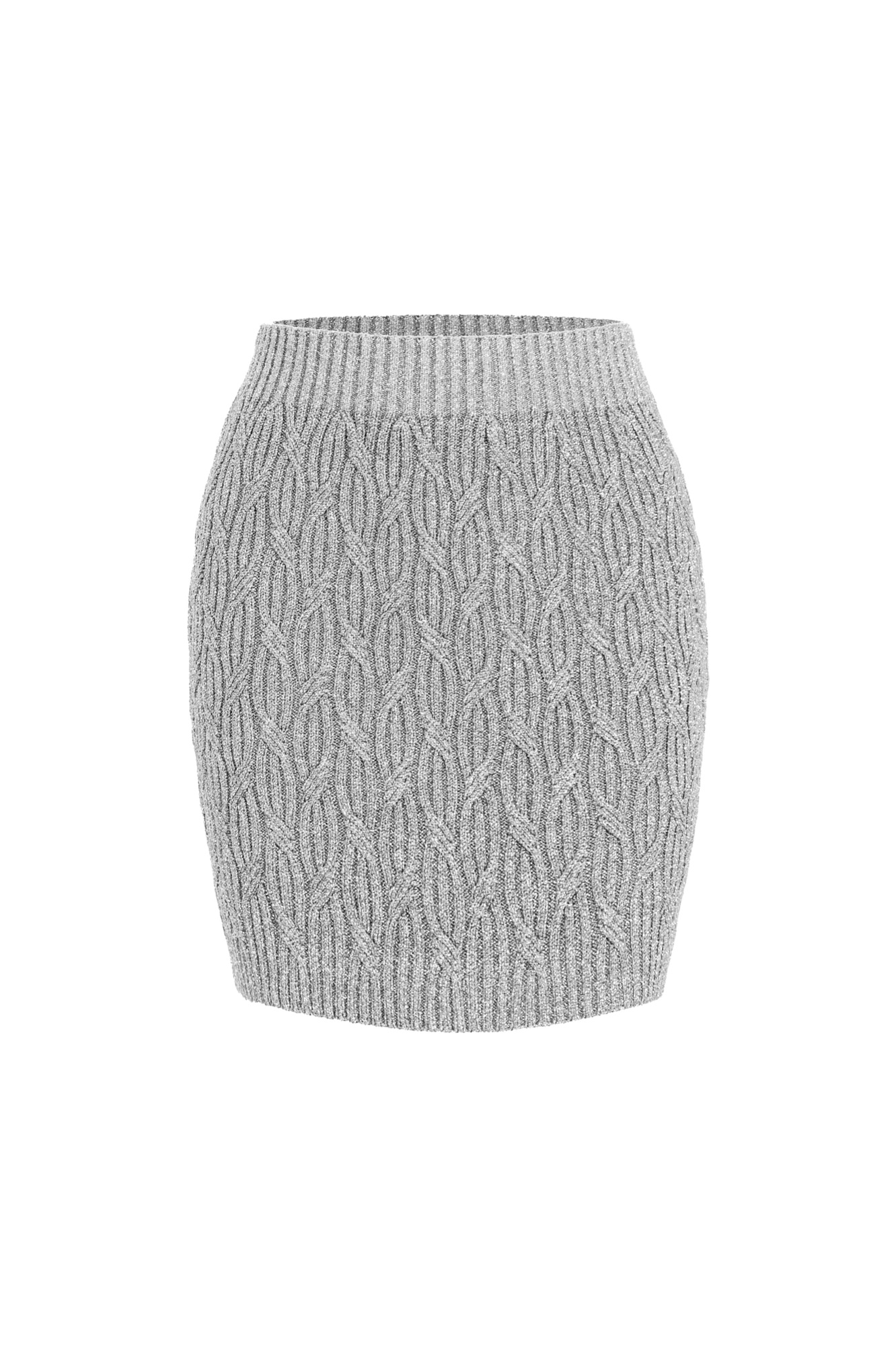 Трикотажная юбка длины мини из вискозы с рельефным узором с добавлением люрекса. Модель приталенного силуэта с эластичным поясом в рубчик.