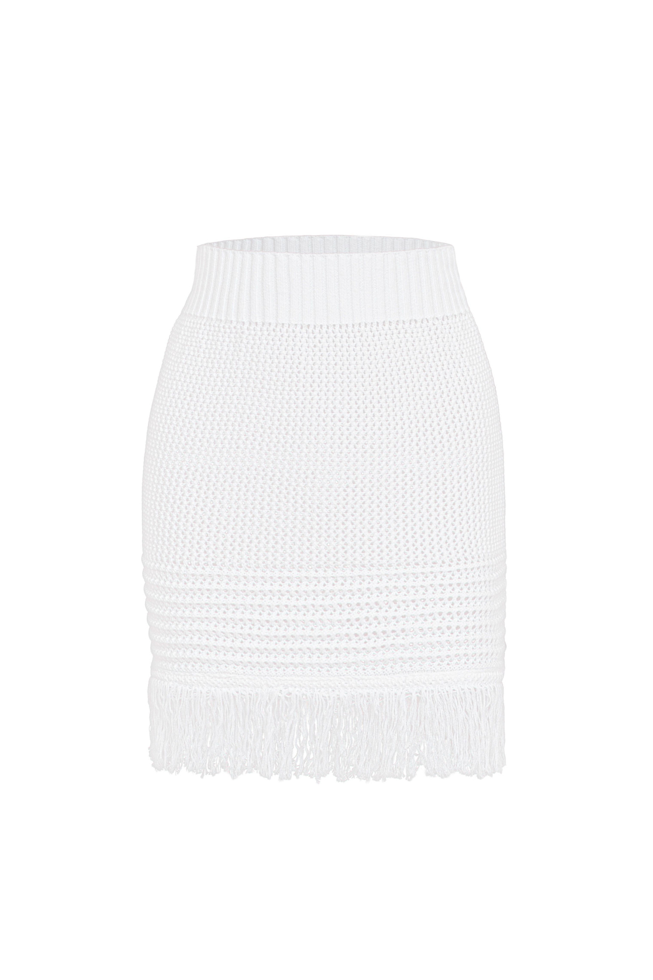 Трикотажная юбка длины мини из 100% хлопка с бахромой по низу изделия. Дополнить образ можно топом в таком же стиле.