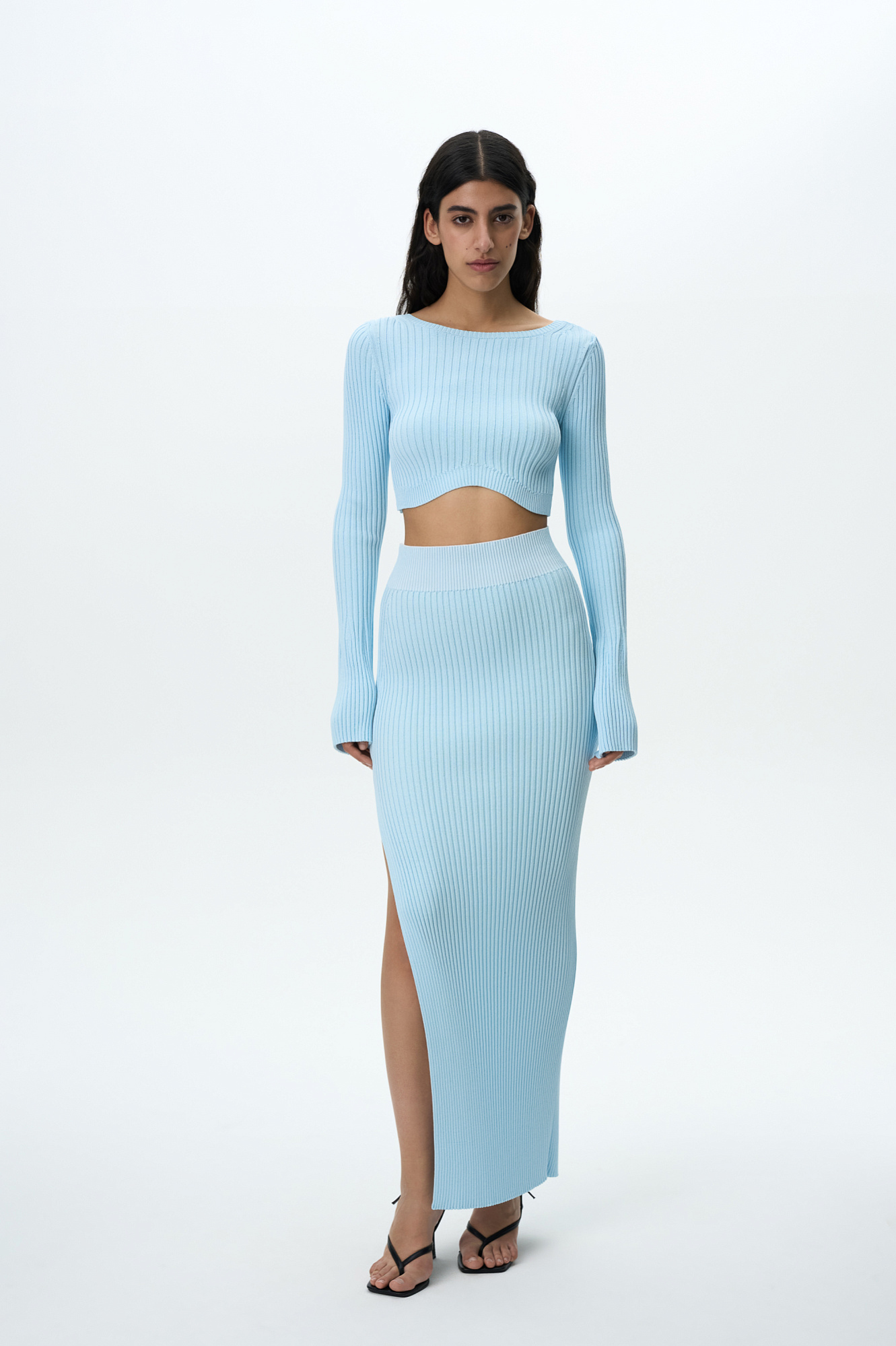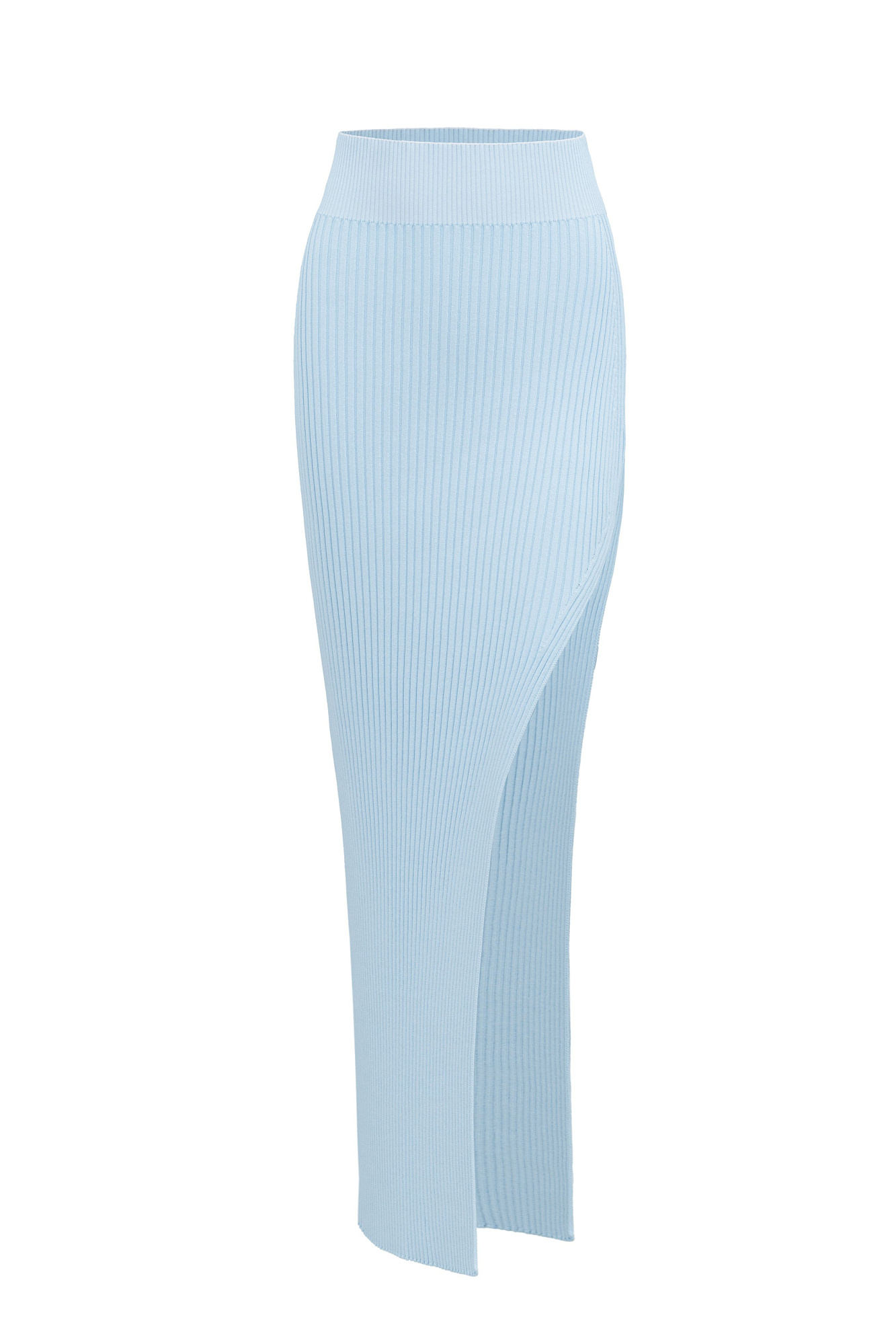 Трикотажная юбка длины макси с разрезом. Облегающий силуэт из вискозы с эластичным поясом в рубчик. Дополнить образ можно топом с открытой спиной из этой же коллекции.