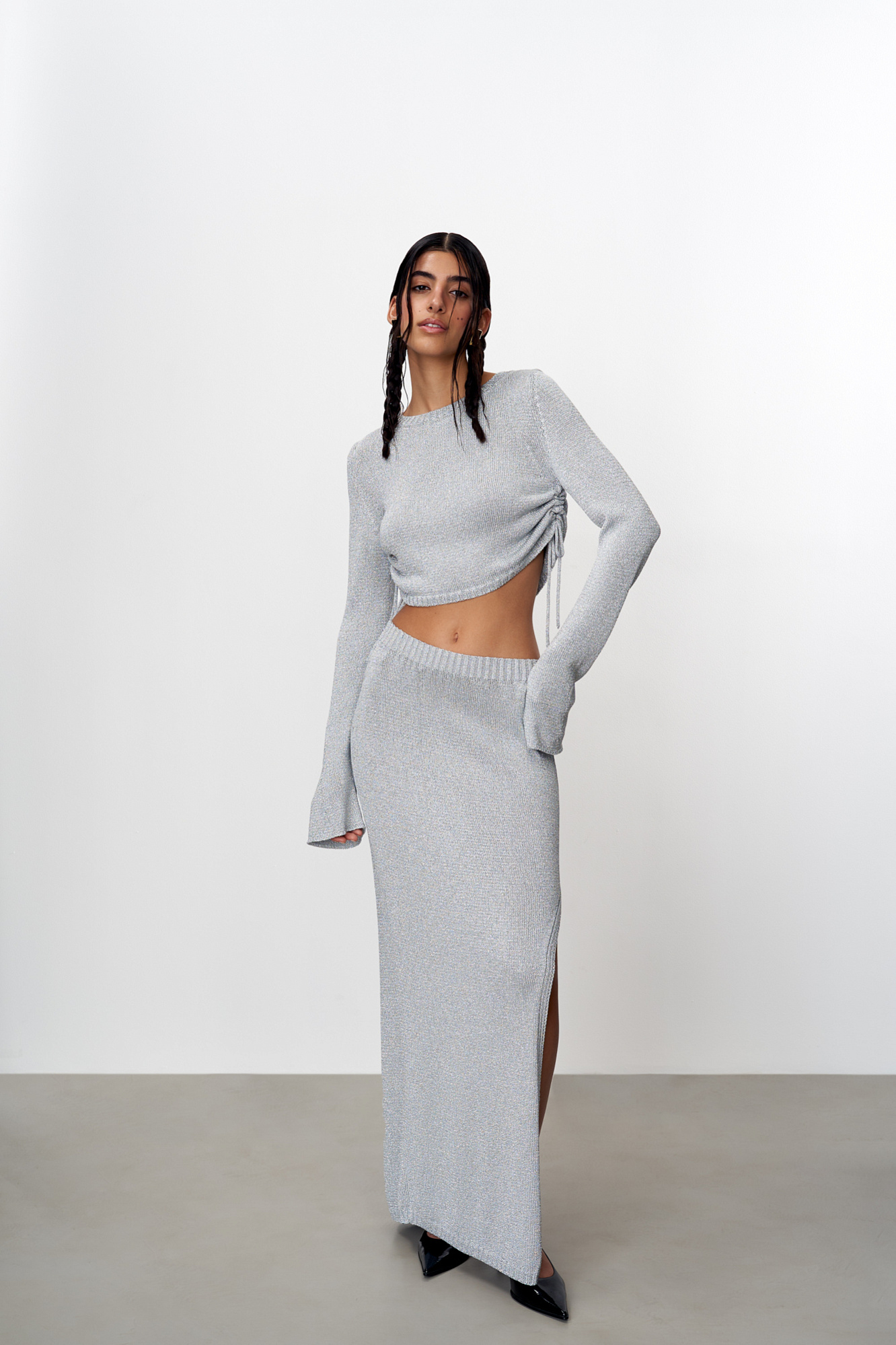 Трикотажная юбка длины макси из вискозы с люрексом. Модель облегающего силуэта, с эластичным поясом в рубчик и разрезом от бедра с кулиской. Дополнить образ можно топом в таком же стиле.