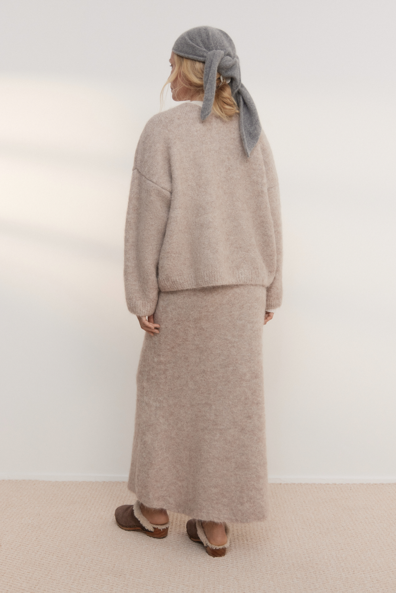 Трикотажная юбка из пушистой пряжи на основе шерсти альпака. Модель приталенного силуэта длины макси с эластичным поясом на резинке.