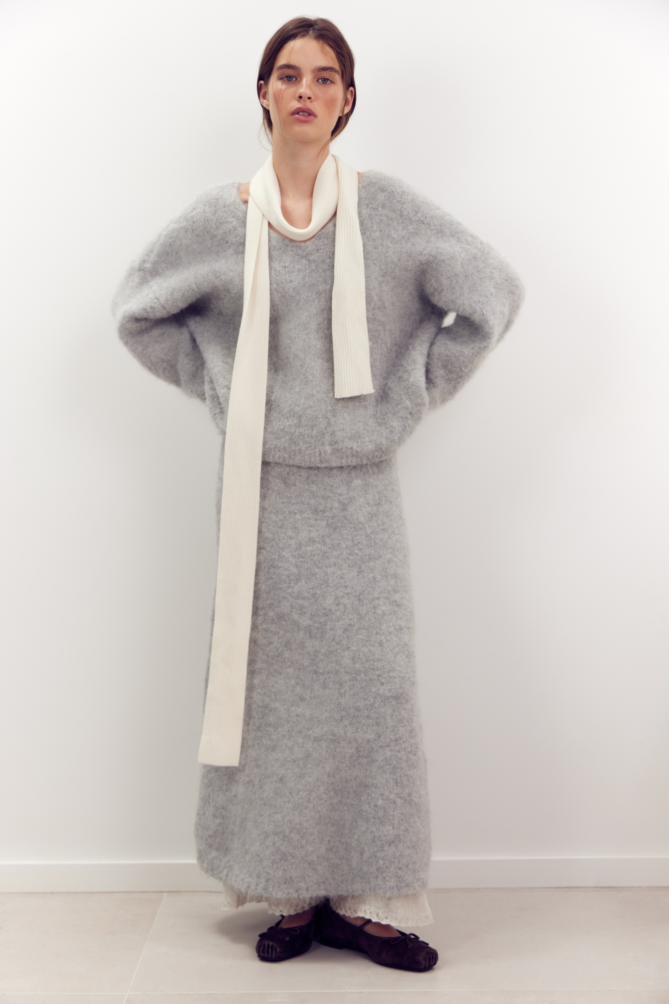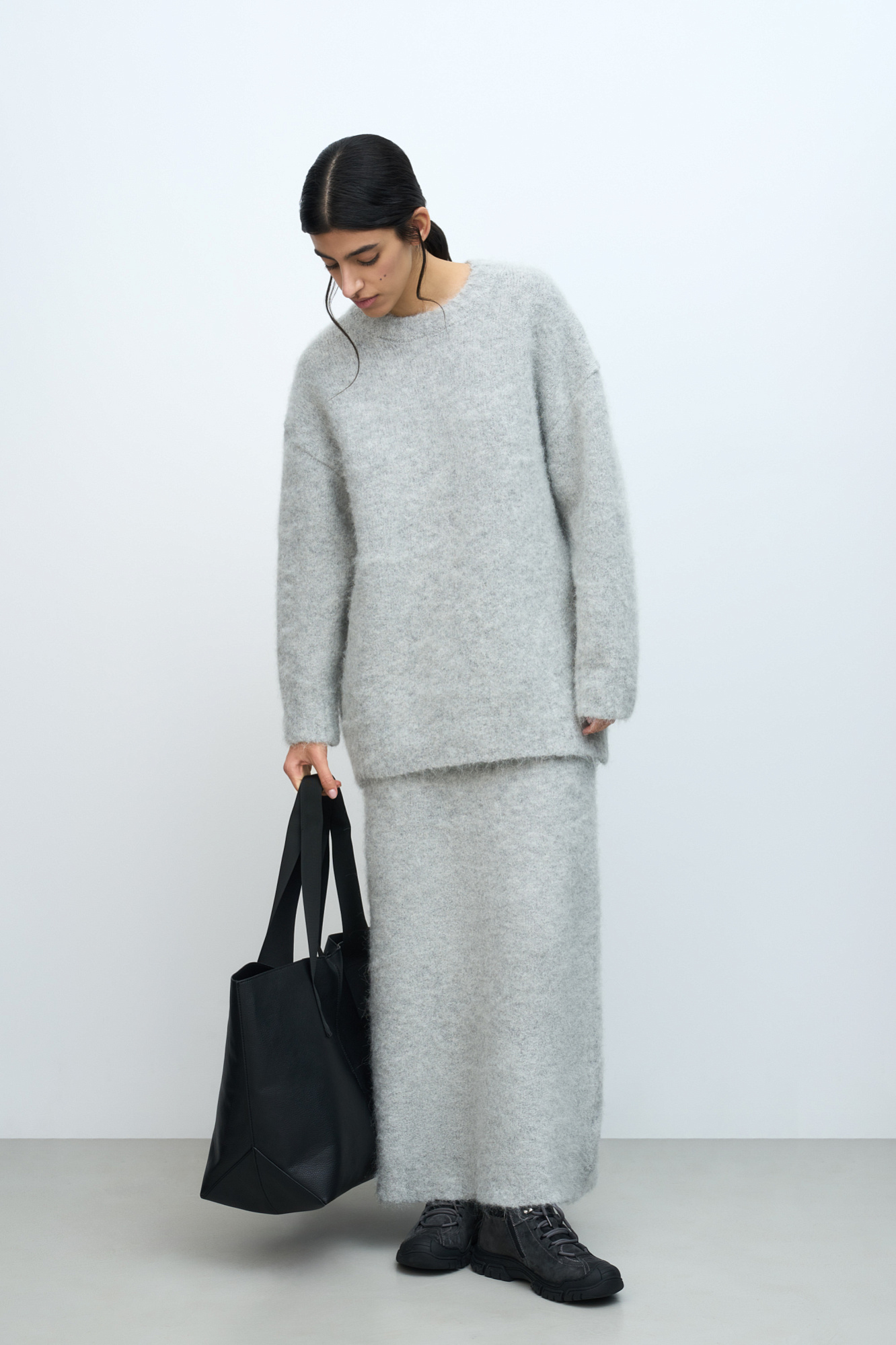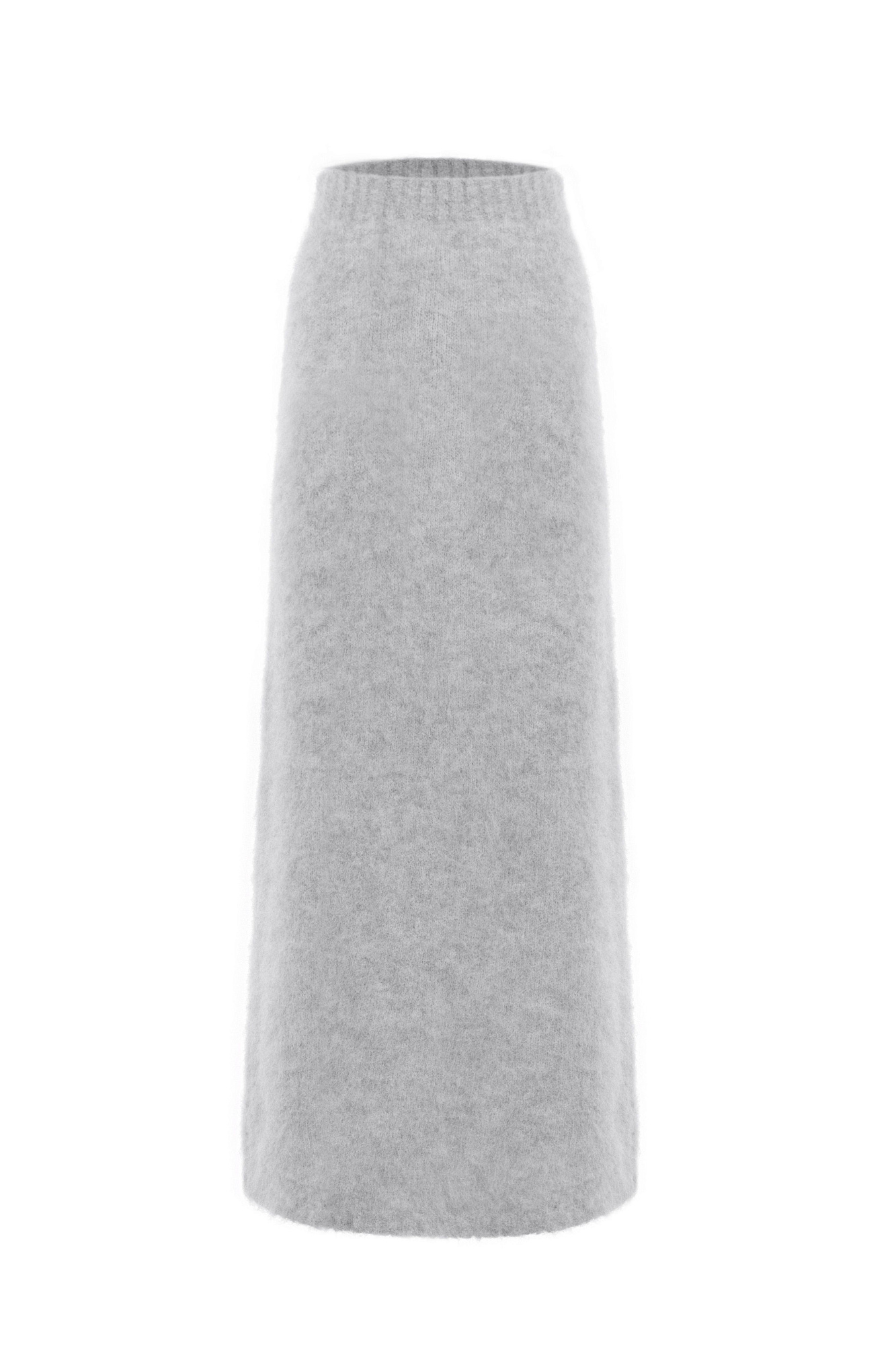 Трикотажная юбка из пушистой пряжи на основе шерсти альпака. Модель приталенного силуэта длины макси с эластичным поясом на резинке.