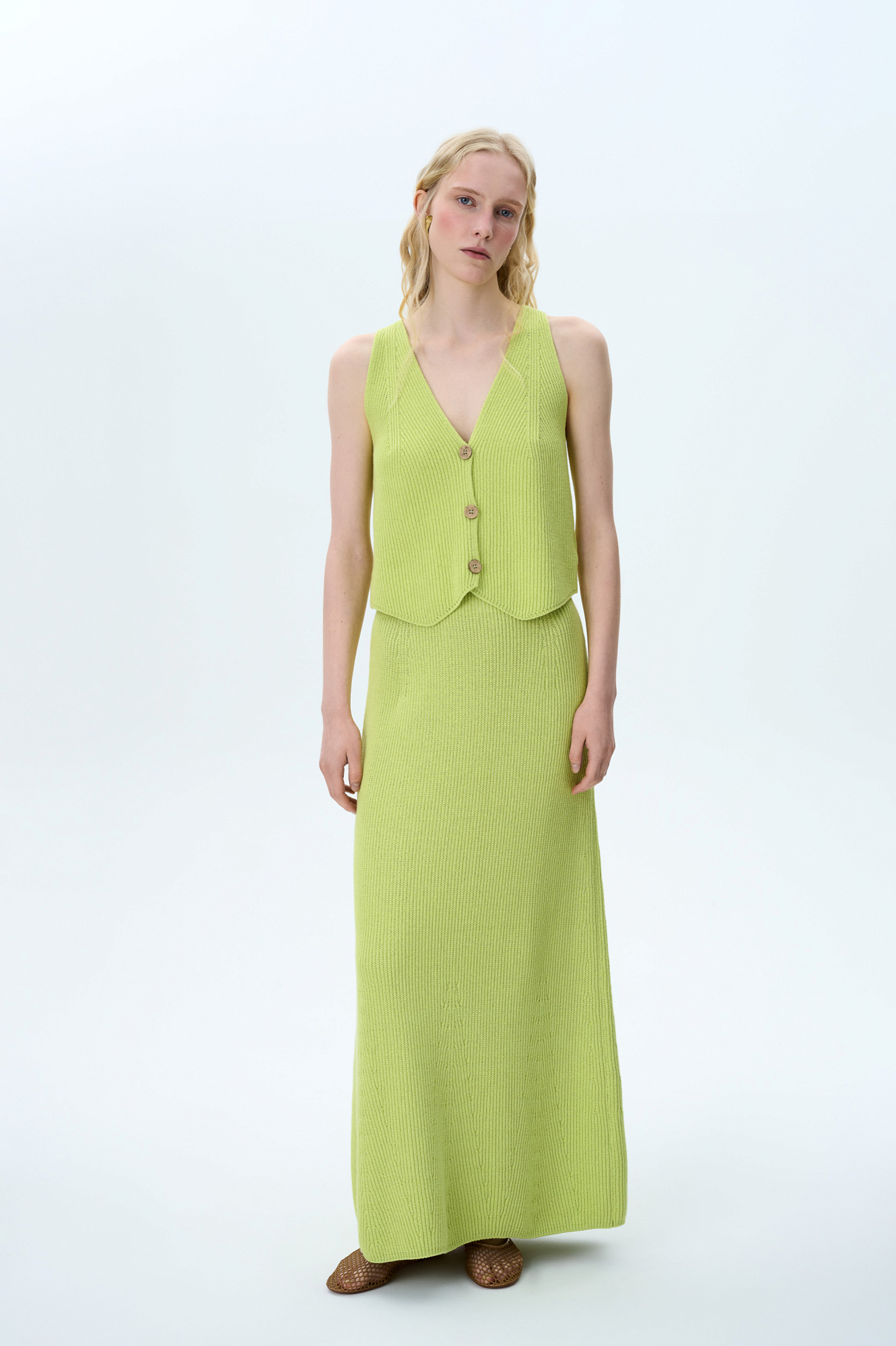 Трикотажная юбка длины макси из хлопка с добавлением вискозы. Модель свободного силуэта с эластичным поясом в рубчик. Дополнить образ можно жилетом в таком же стиле.