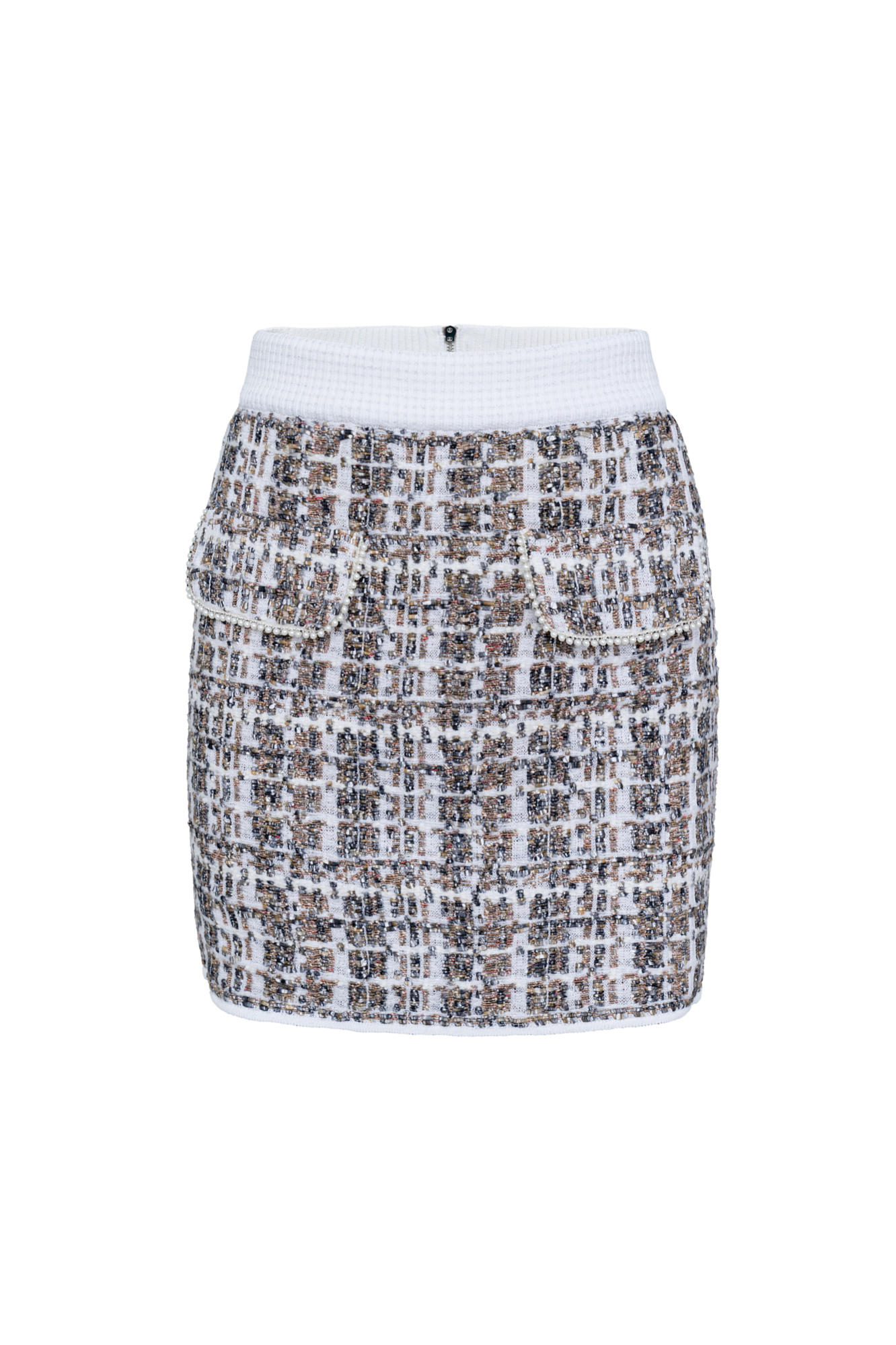 Трикотажна юбка длины мини. Модель классического силуэта выполнена из фактурного твида с имитацией накладных карманов и застежкой на молнию.