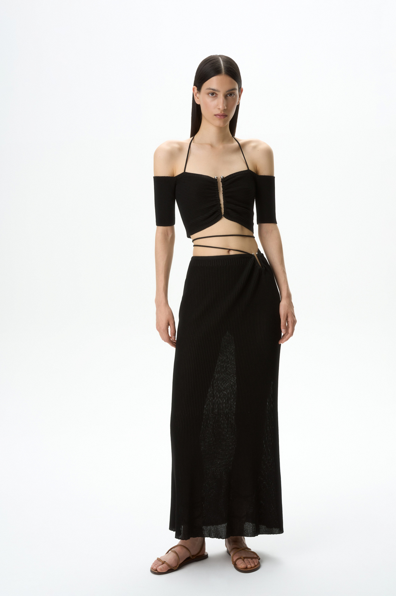 Трикотажная юбка макси с металлической перемычкой и шнуровкой на талии. Дополнить образ можно топом.