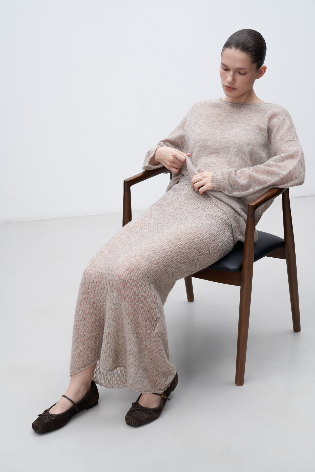 Ажурная юбка длины макси из шерсти мериноса с добавлением шерсти альпака. Эластичный пояс в рубчик. Без подкладки.