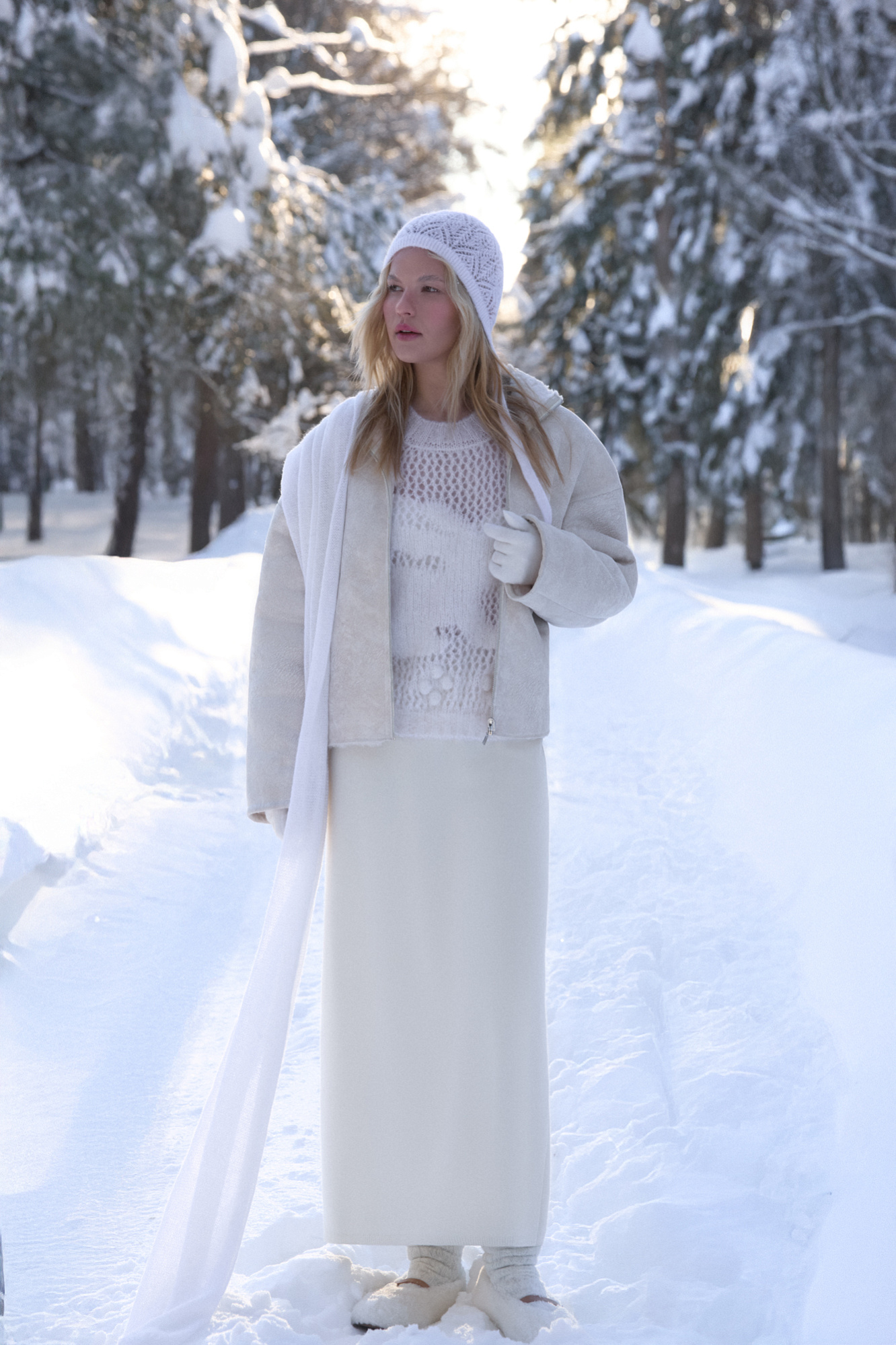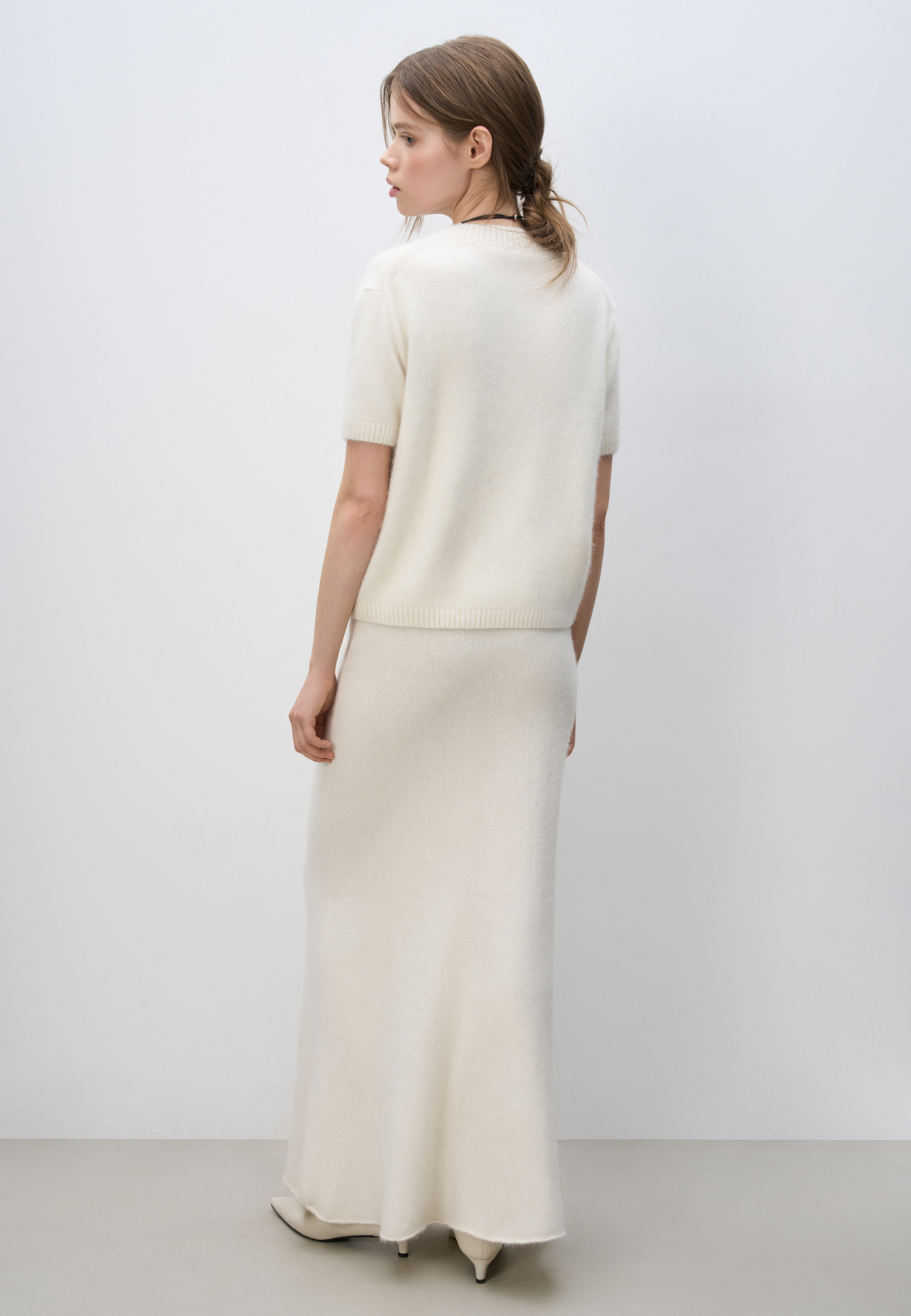 Трикотажная юбка длины макси из пуха лисы. Модель А-силуэта, с эластичным поясом на резинке и валиком по низу подола. Дополнить образ можно джемпером в таком же стиле.