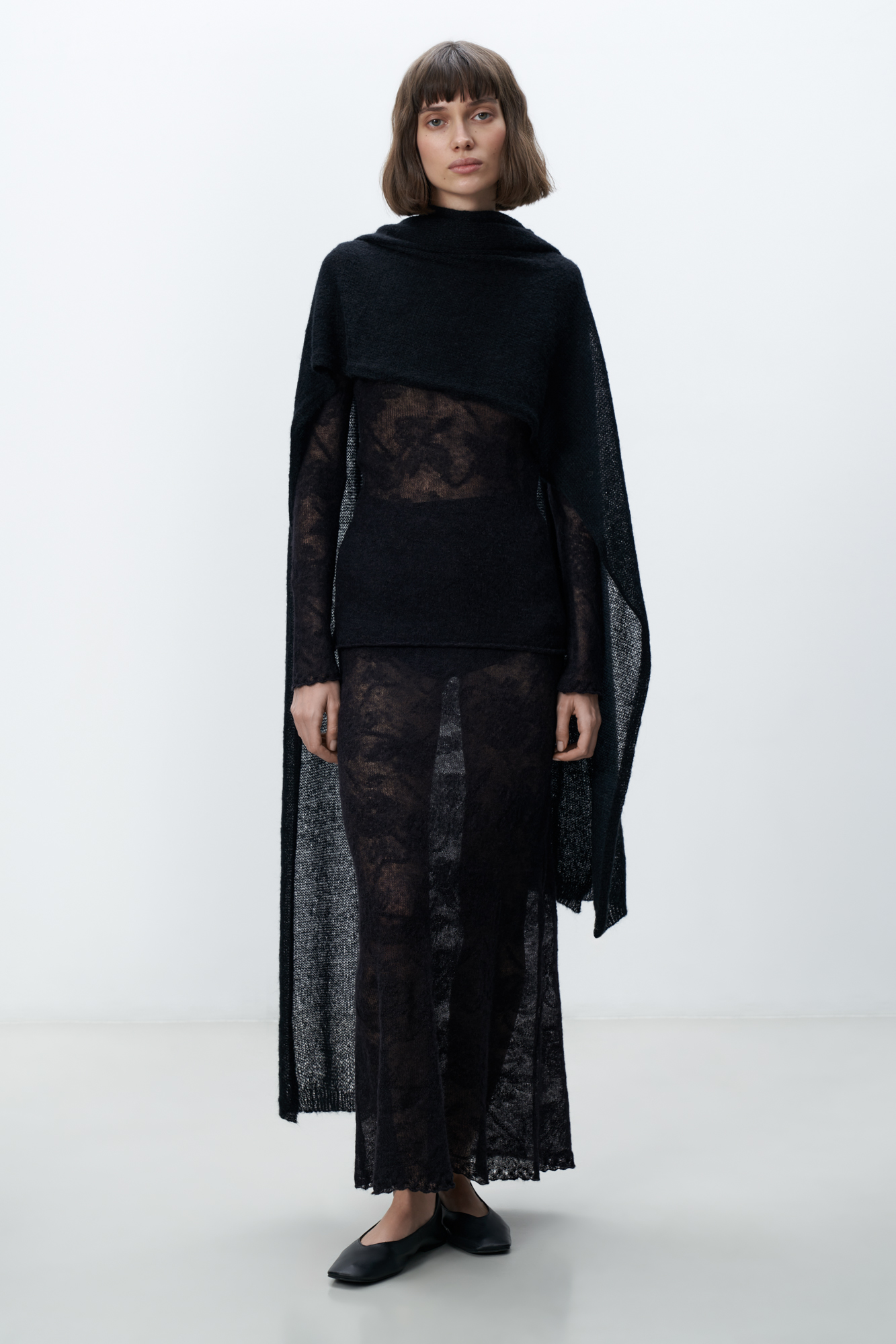 Ажурная юбка длины макси из шерсти беби альпака и супер кид мохера. Модель с эластичным поясом. Низ изделия декорирован кружевной каймой. Без подкладки.
