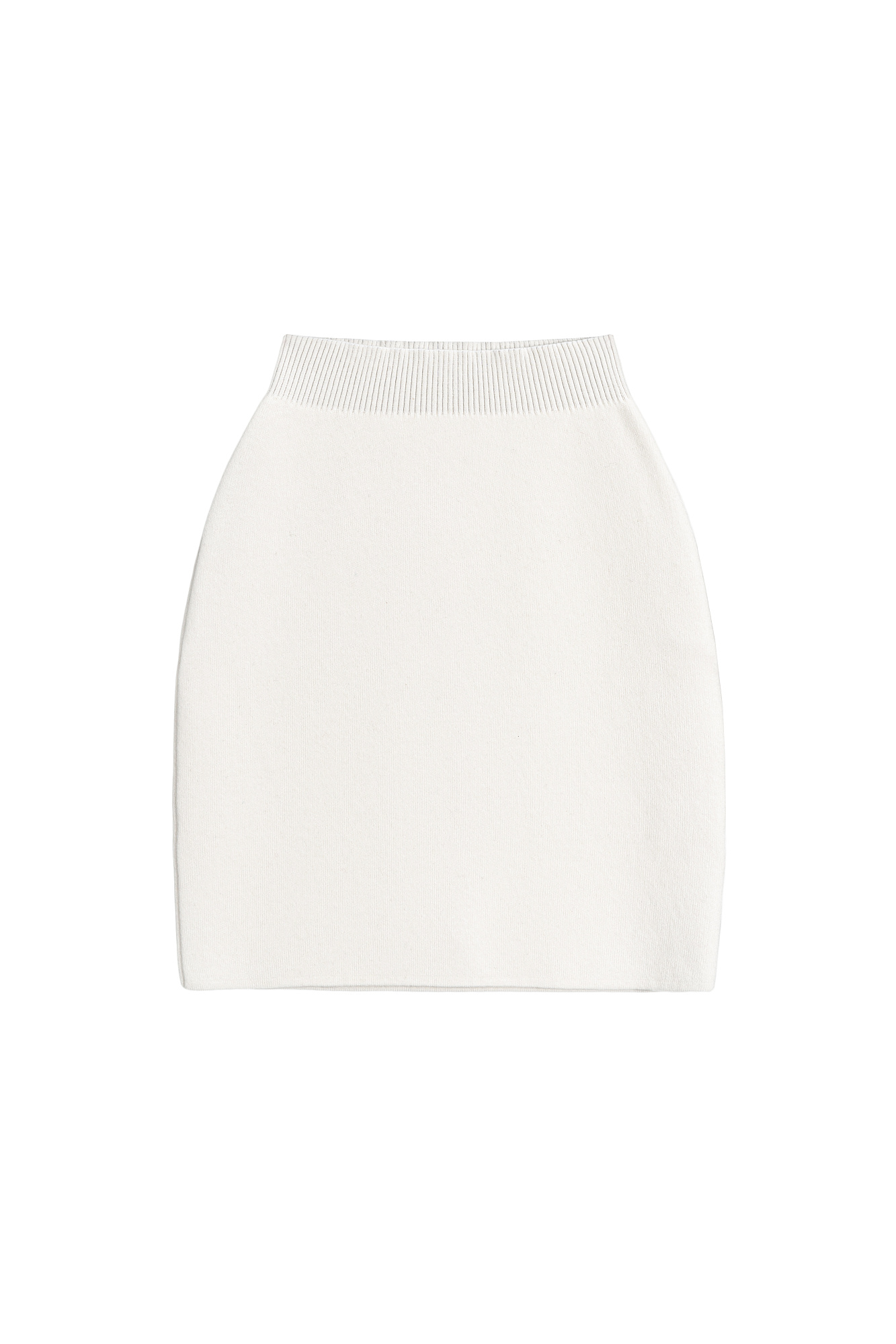 Трикотажная юбка длины мини из смесовой шерсти с добавлением кашемира. Модель приталенногоо силуэта с эластичным поясом в рубчик.