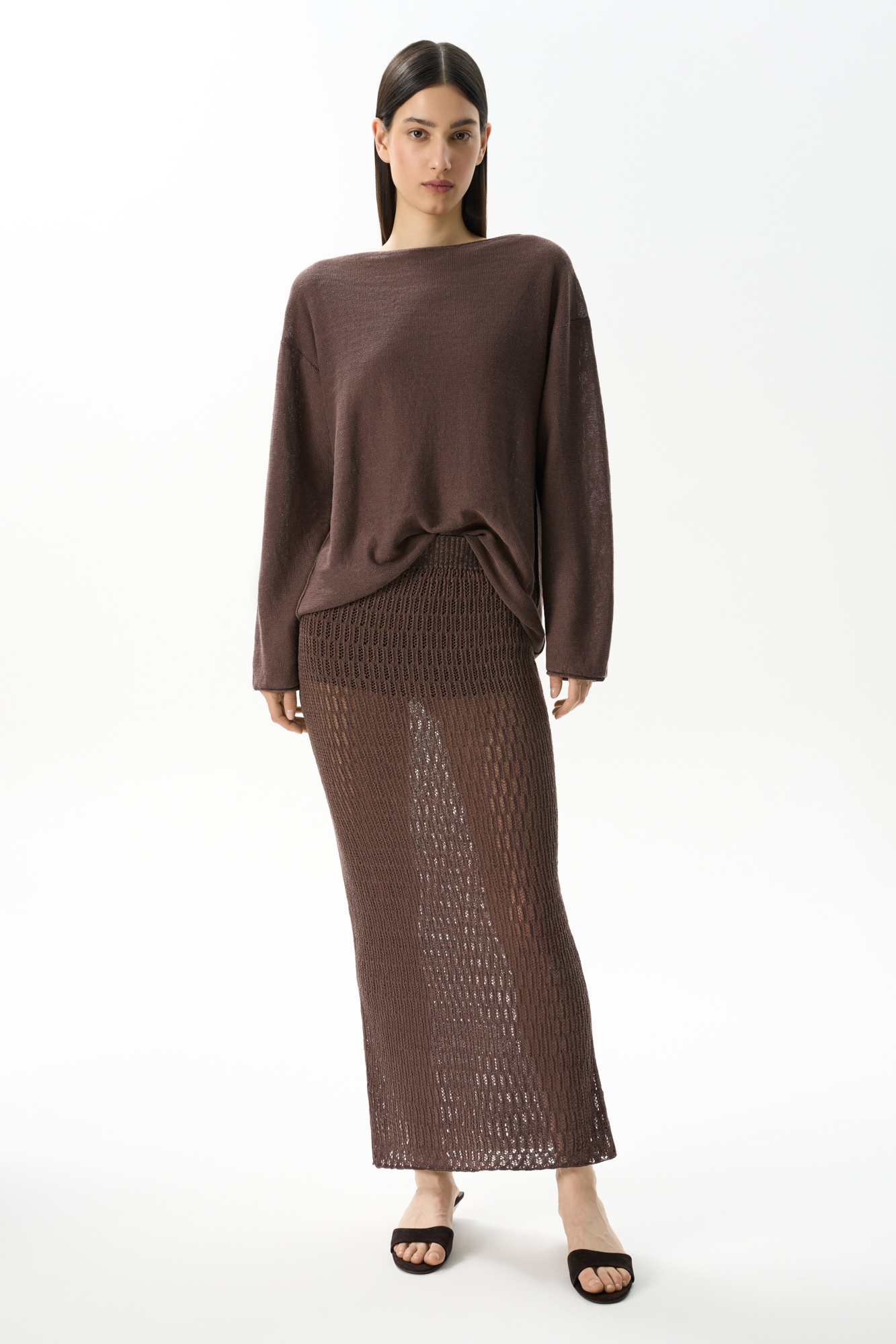 Ажурная юбка длины макси из 100% льна. Модель прямого кроя, с эластичным поясом на резинке.
