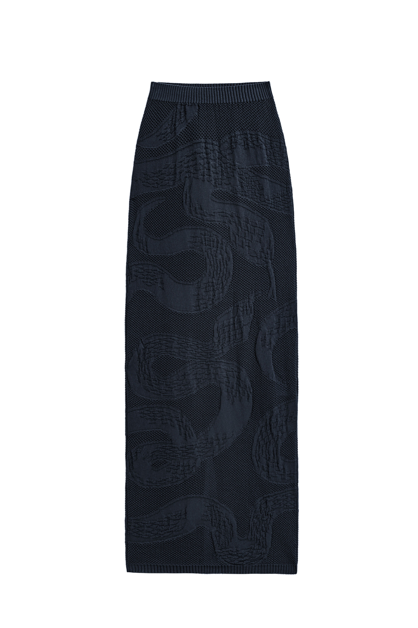 Трикотажная юбка длины макси из органического хлопка. Модель по фигуре, с широким эластичным поясом в рубчик и разрезом сзади. Изделие декорировано жаккардовым узором в виде змеи. Без подкладки.
