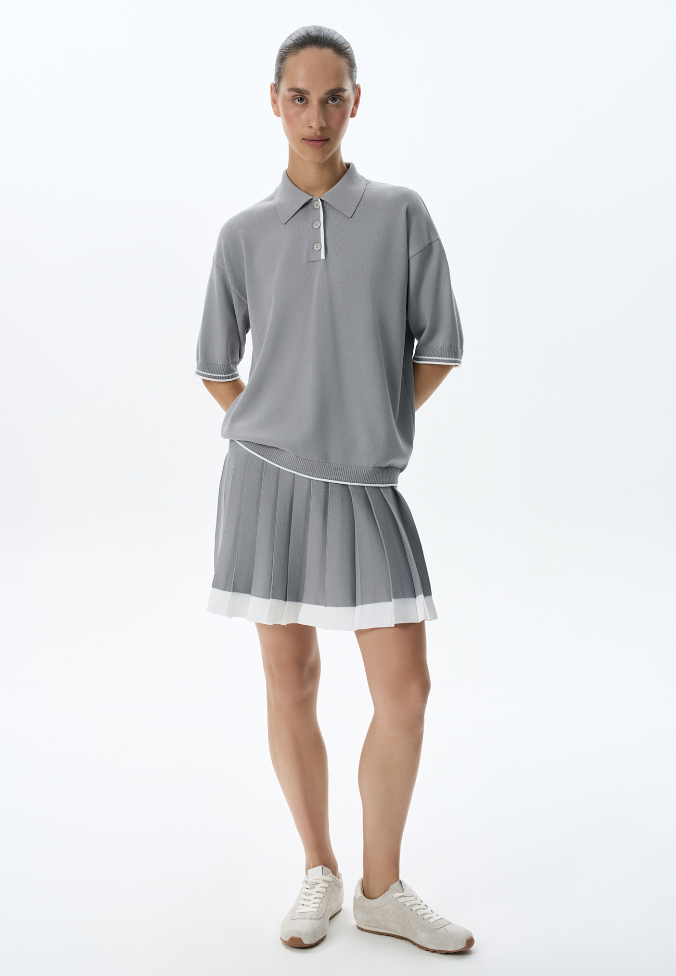 Трикотажная юбка плиссе длины мини из вискозы. Модель с широким эластичным поясом в рубчик. Пояс и нижняя часть юбки выполнены из пряжи контрастного цвета.