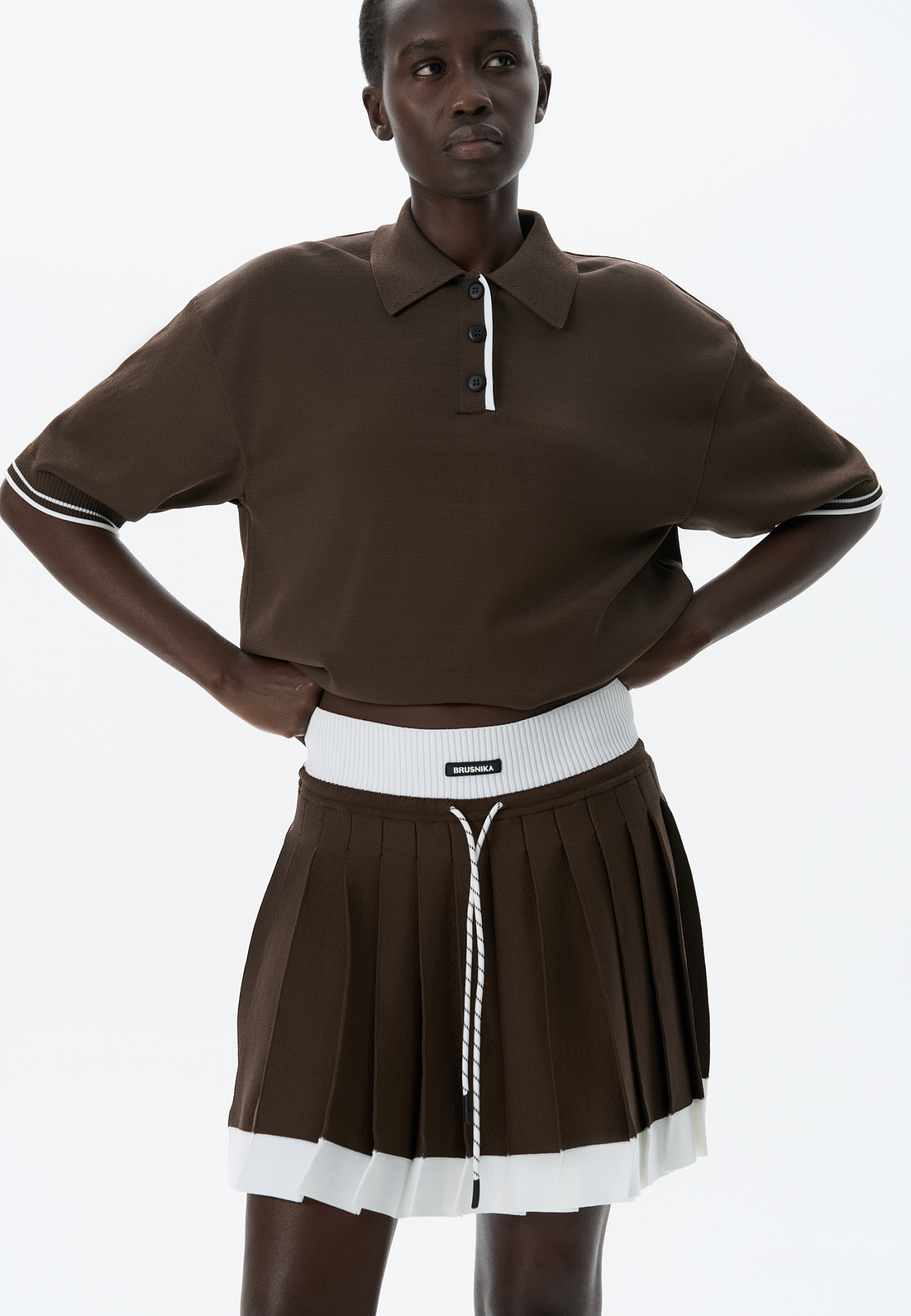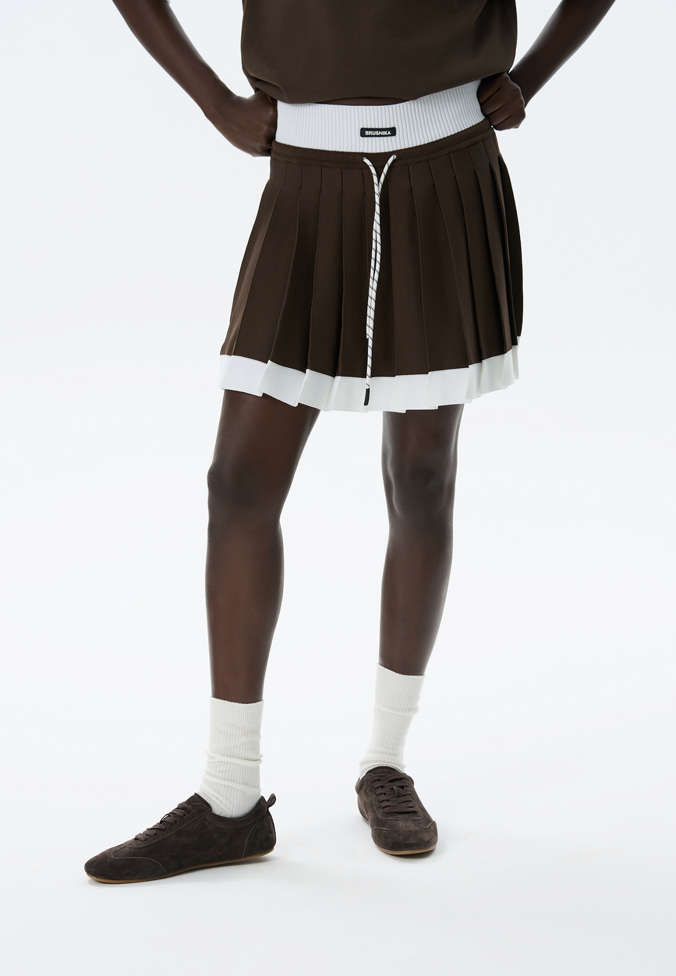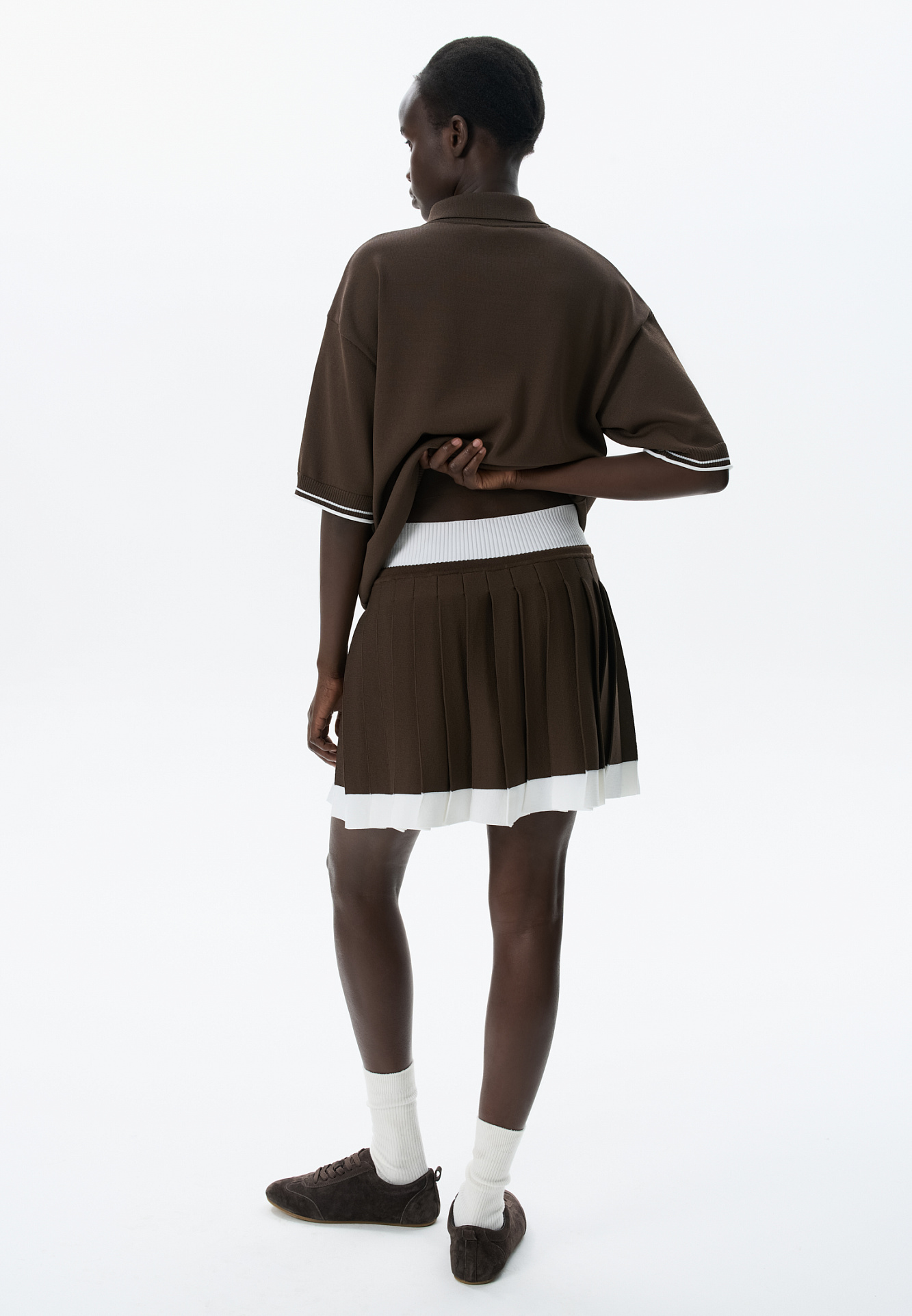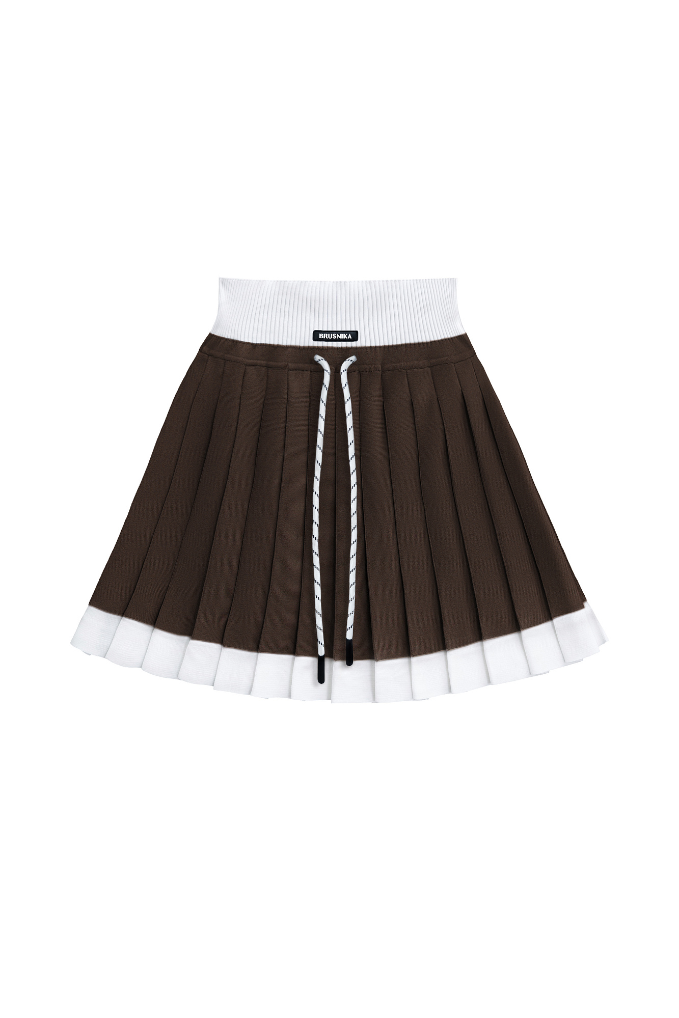 Трикотажная юбка плиссе длины мини из вискозы. Модель с широким эластичным поясом в рубчик. Пояс и нижняя часть юбки выполнены из пряжи контрастного цвета.