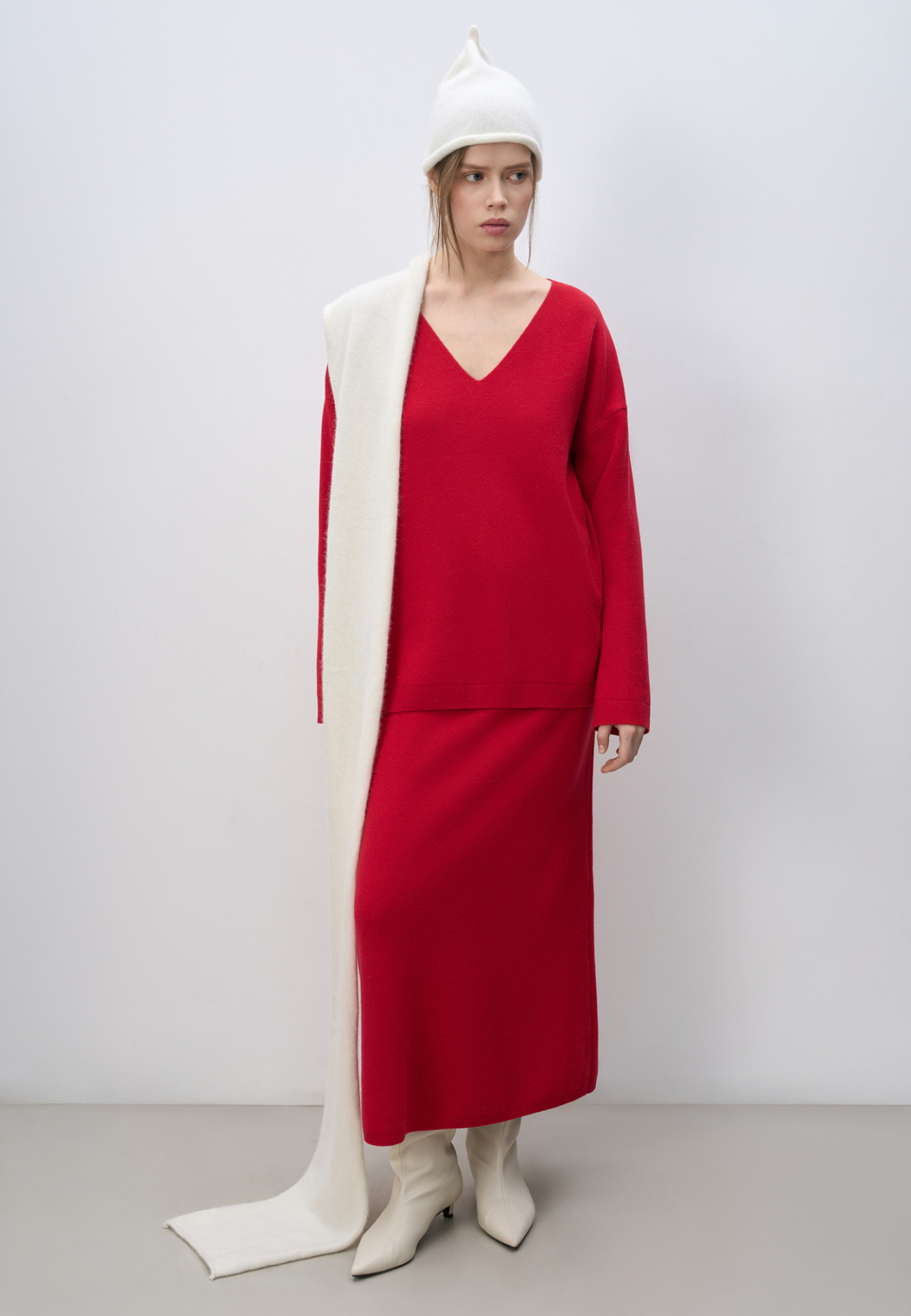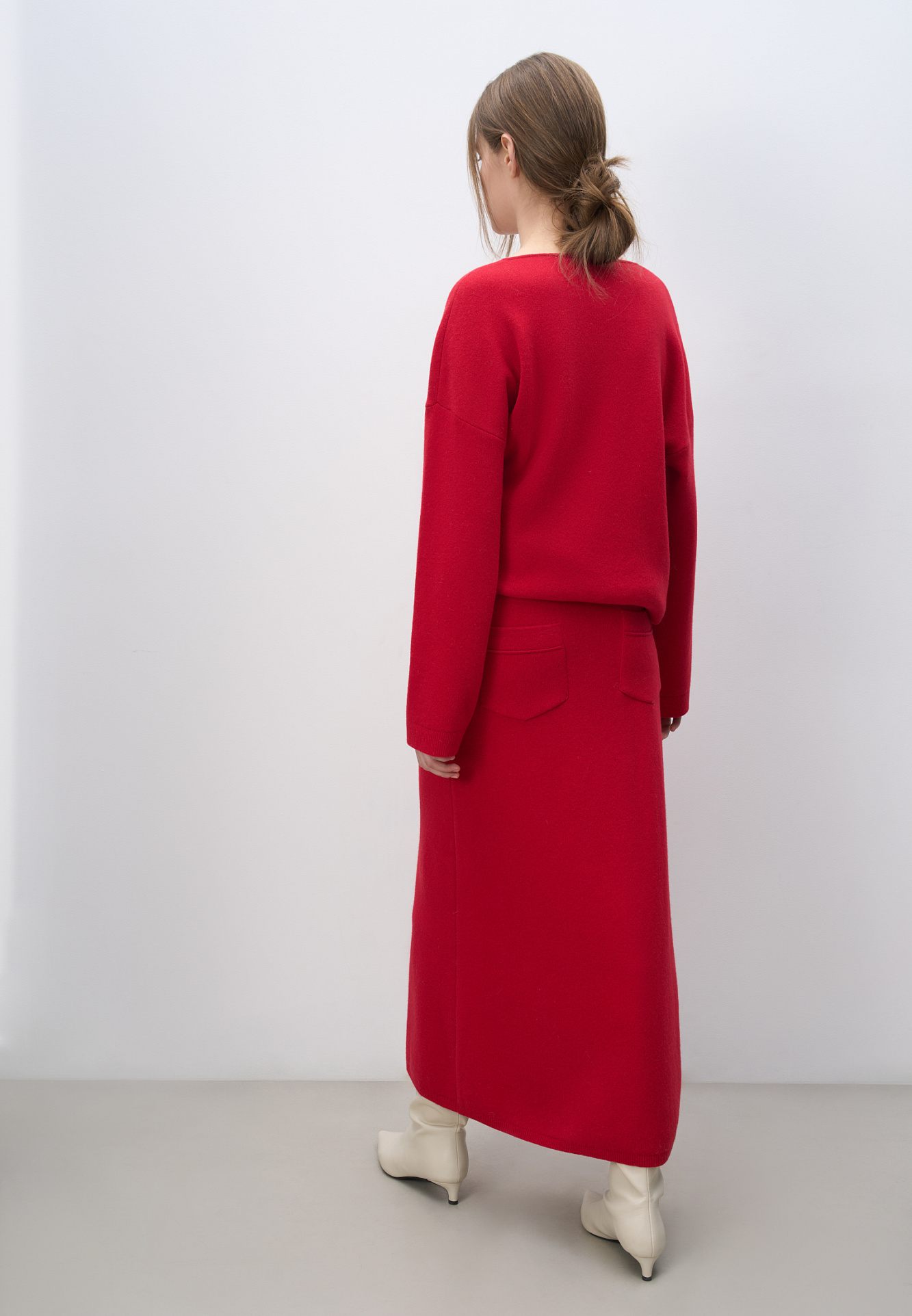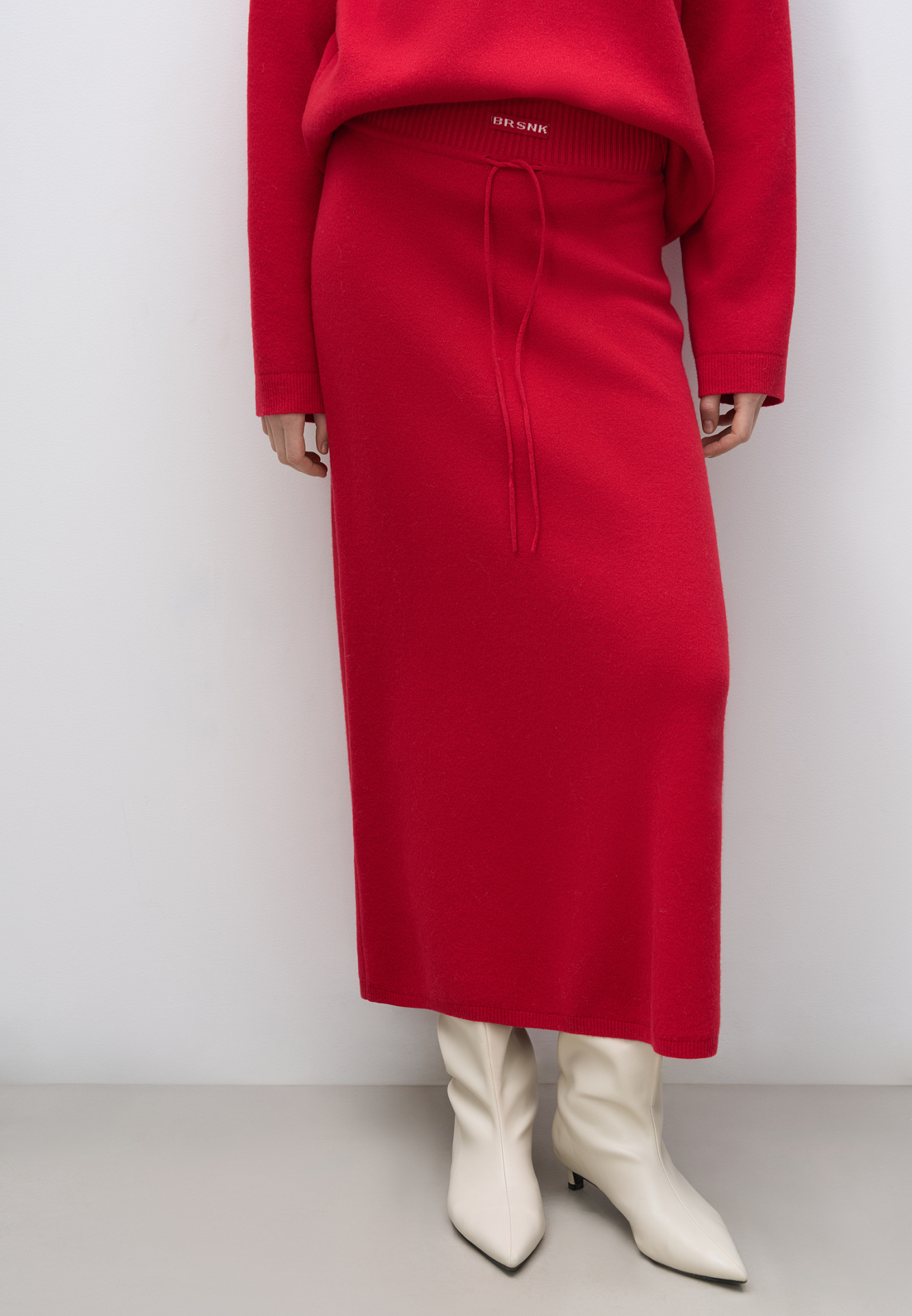 Трикотажная юбка длины макси из кашемира и шерсти. Модель по фигуре, с широким эластичным поясом в рубчик, дополненным кулиской и двумя накладными карманами сзади. Изделие декорировано вывязанным логотипом.
