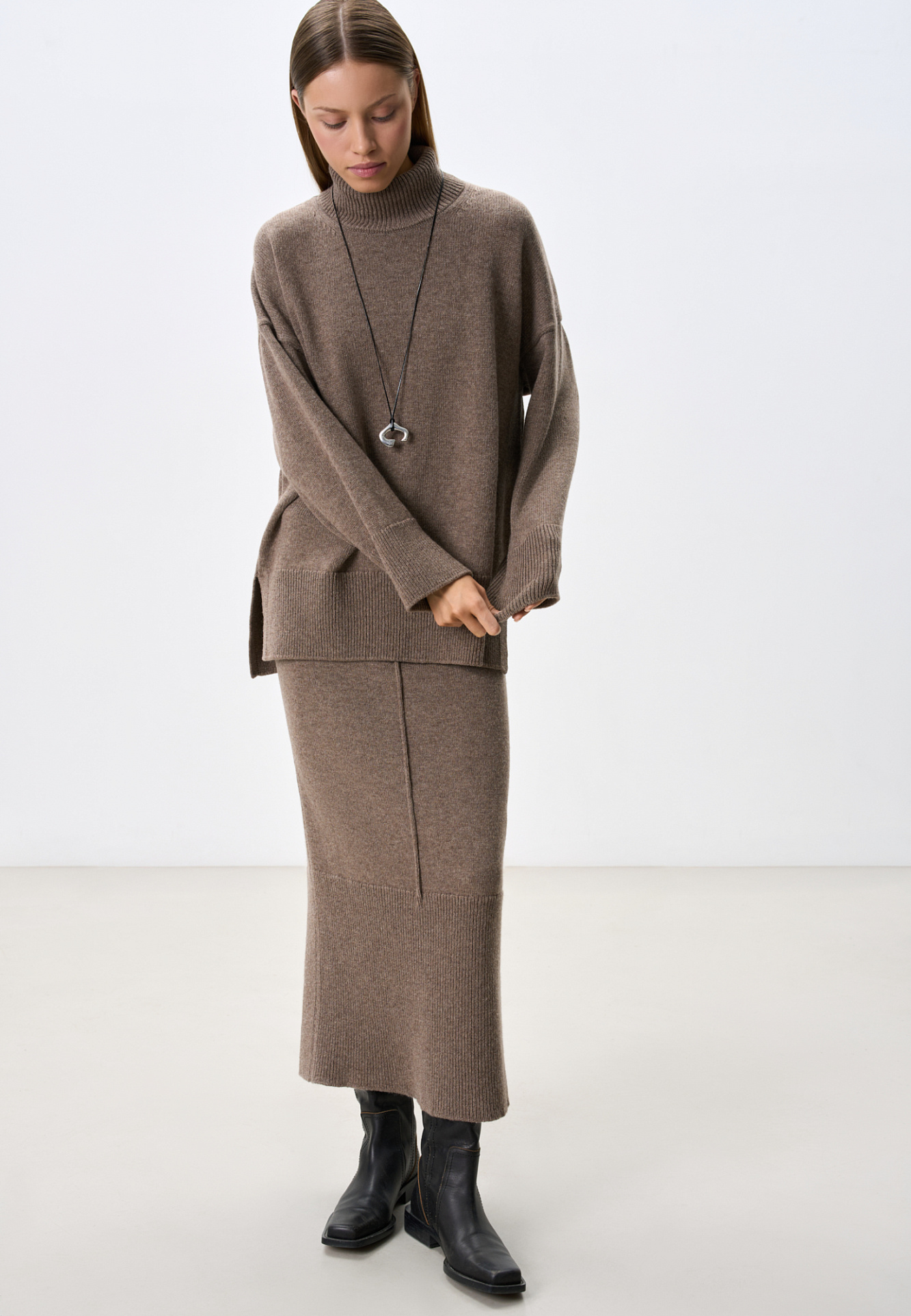 Юбка длины макси из кашемира и шерсти. Модель прямого силуэта, с широким эластичным поясом на кулиске. Изделие декорировано вертикальным валиком и невысоким разрезом сзади.