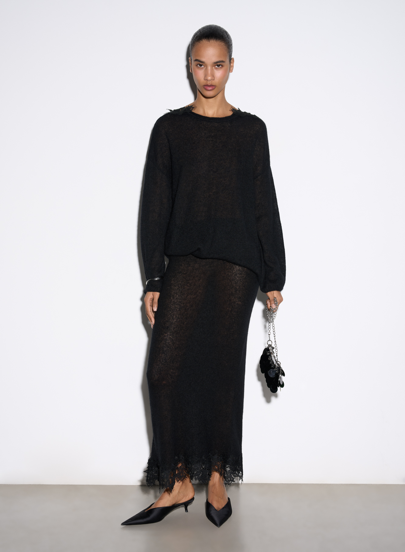 Трикотажная юбка из шерсти мериноса экстрафайн и альпака экстрафайн. Модель А-силуэта с широким поясом на резинке. Подол изделия декорирован кружевом.