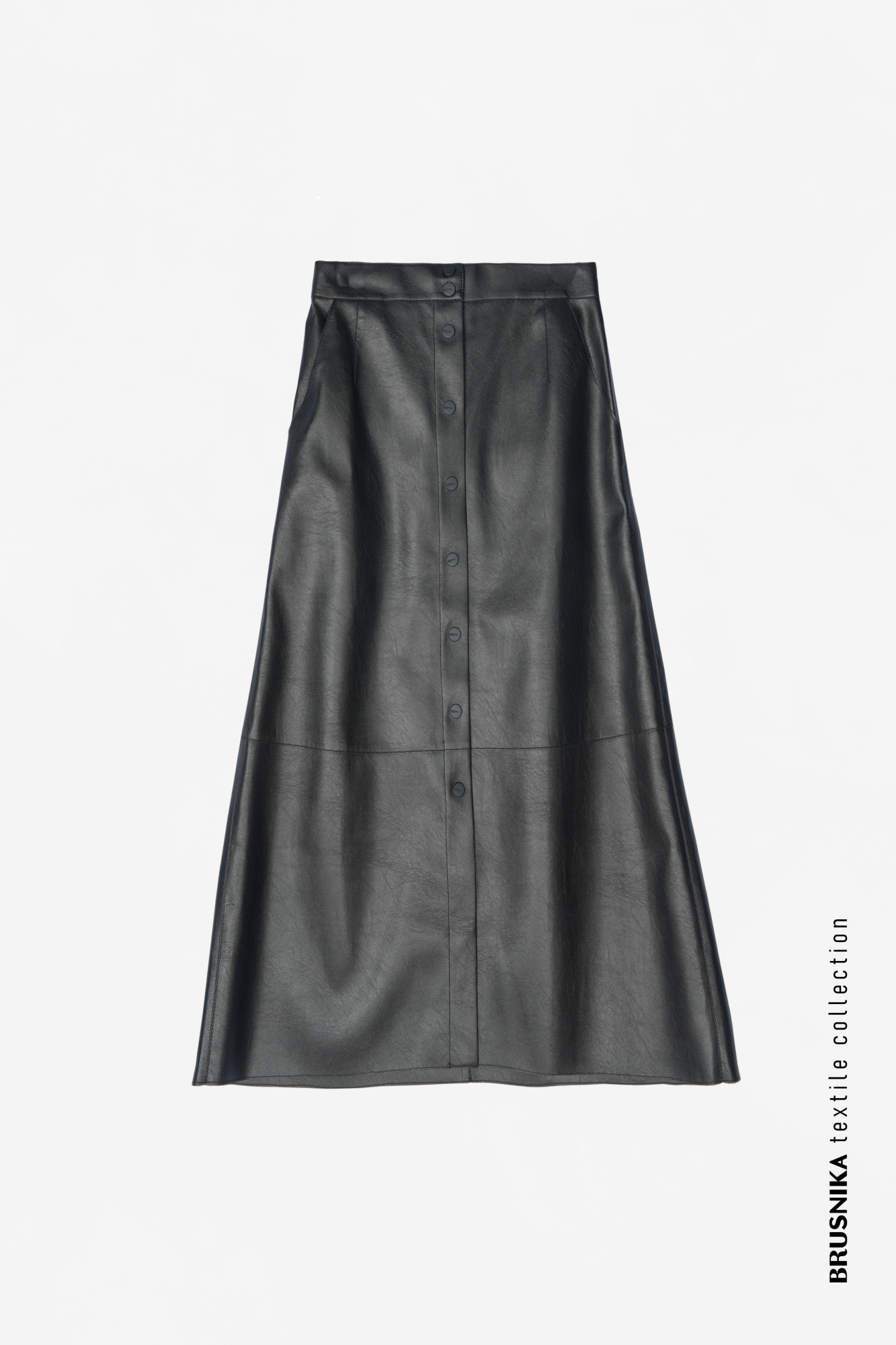 Юбка длины миди из двусторонней экокожи. Силуэт - трапеция. Застежка на кнопки.