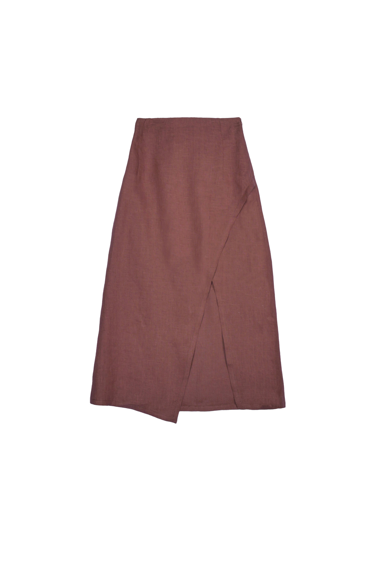 Юбка из 100% льна на запах с разрезом, поясом на эластичной ленте и накладными карманами сзади.