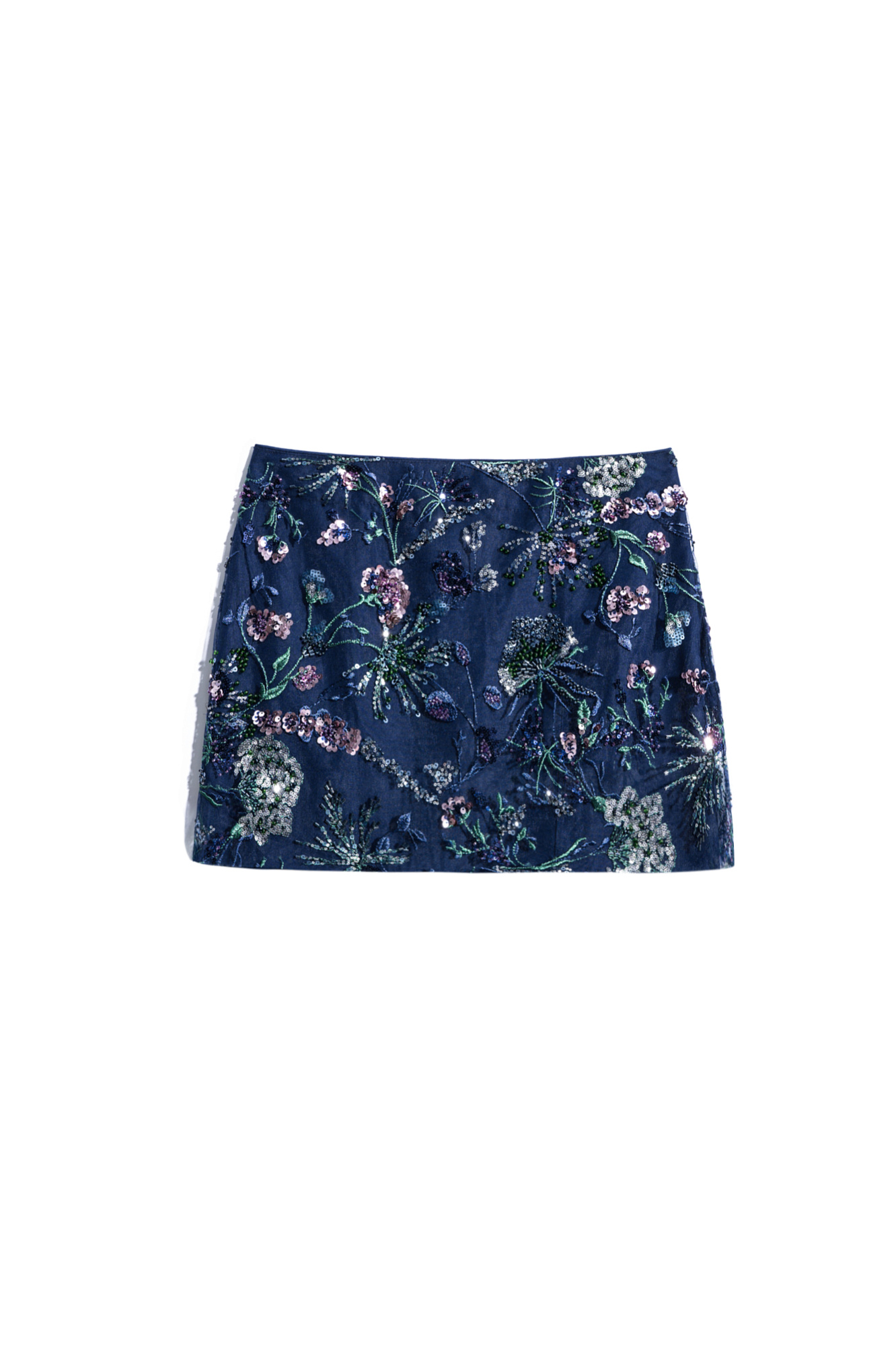 Юбка длины мини с цветочным орнаментом, вышитым пайетками и бисером. Застежка на потайную молнию. Изделие выполнено на подкладке.