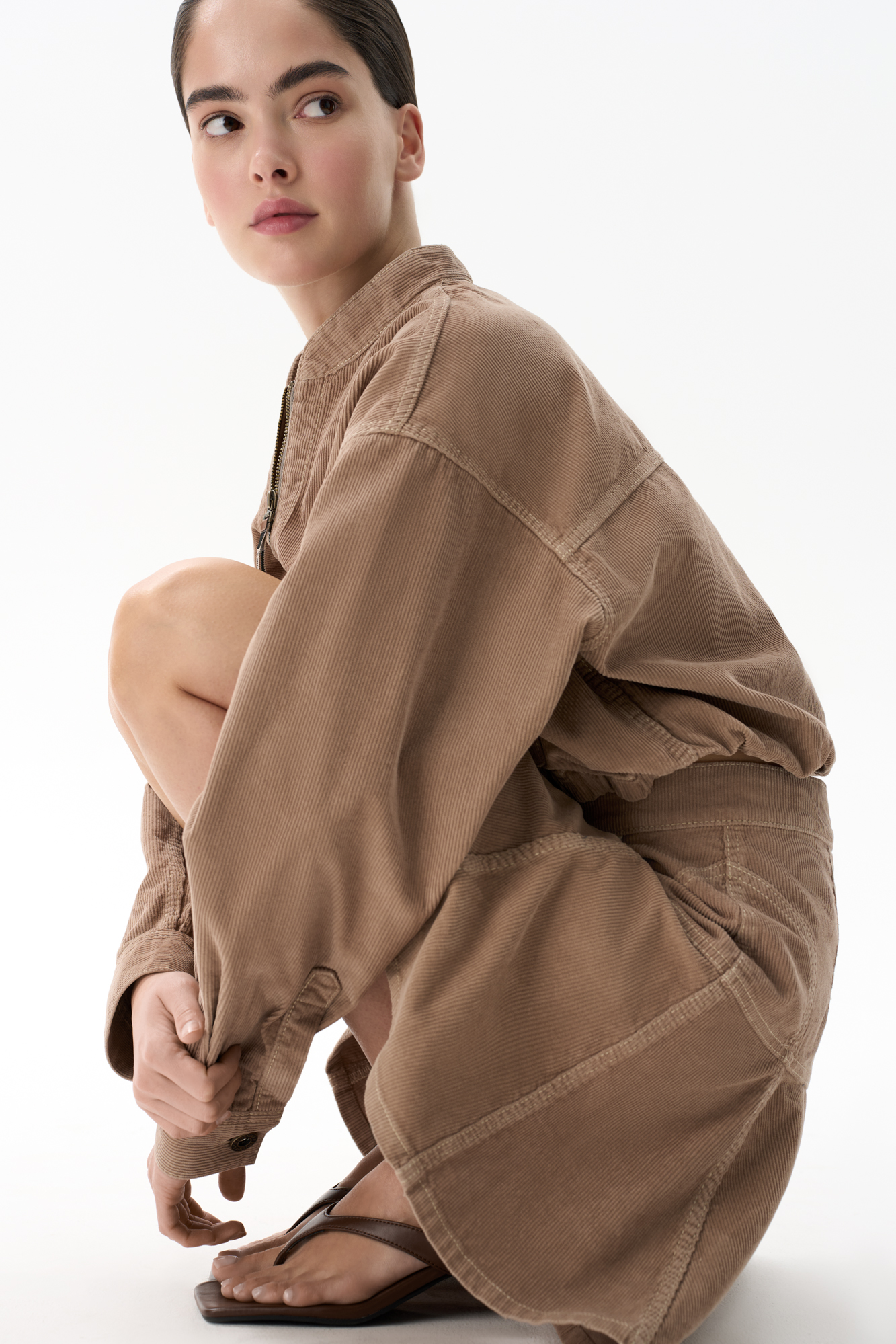 Вельветовая юбка длины мини с брендированным ярлыком на поясе и застежкой на молнию сзади. Дополнить образ можно бомбером.