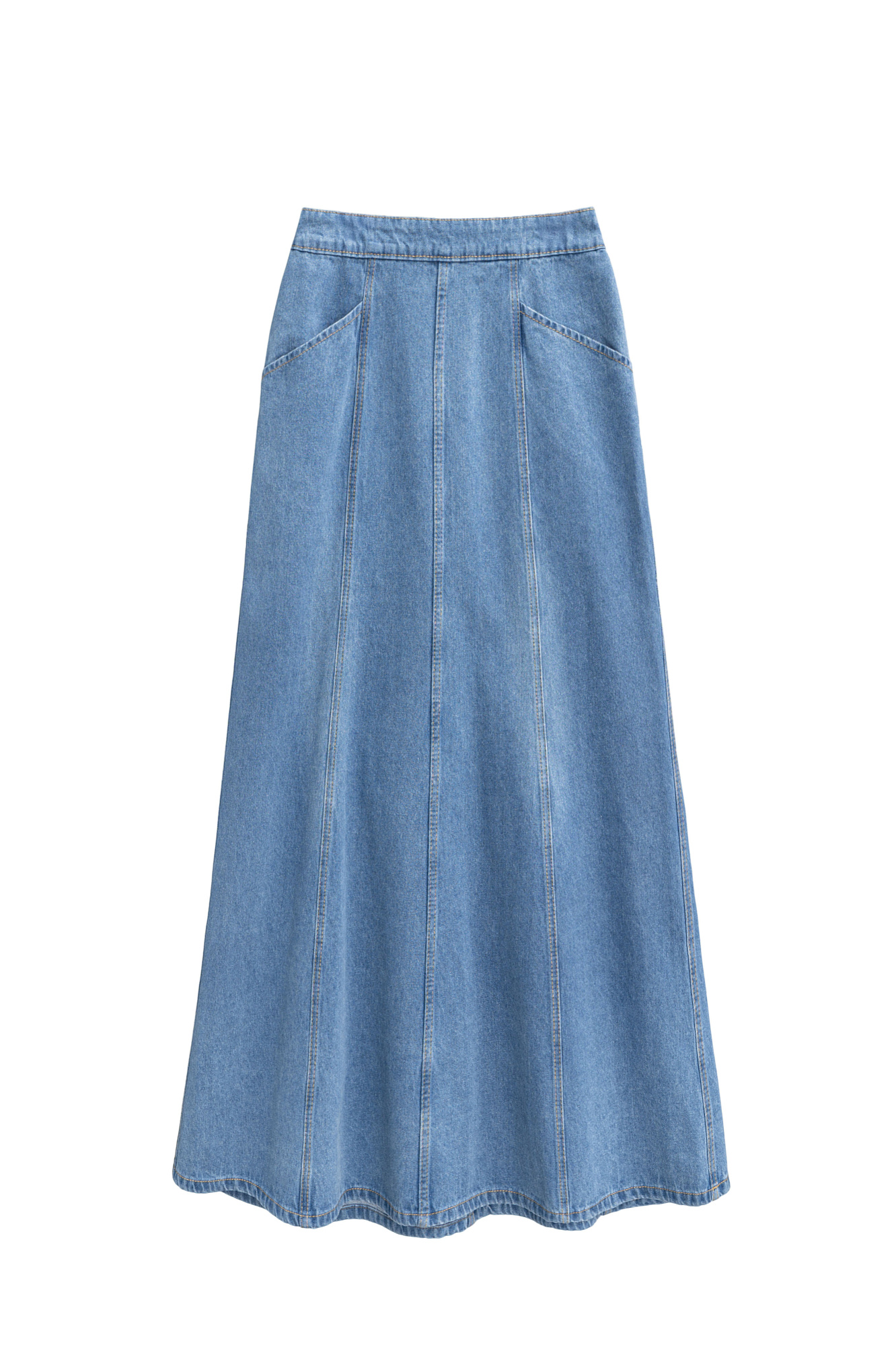 Джинсовая юбка из 100% хлопка длины миди. Модель А-силуэта с объемными вертикальными швами, двумя прорезными карманами спереди и двумя накладными карманами сзади. Застежка на молнию.