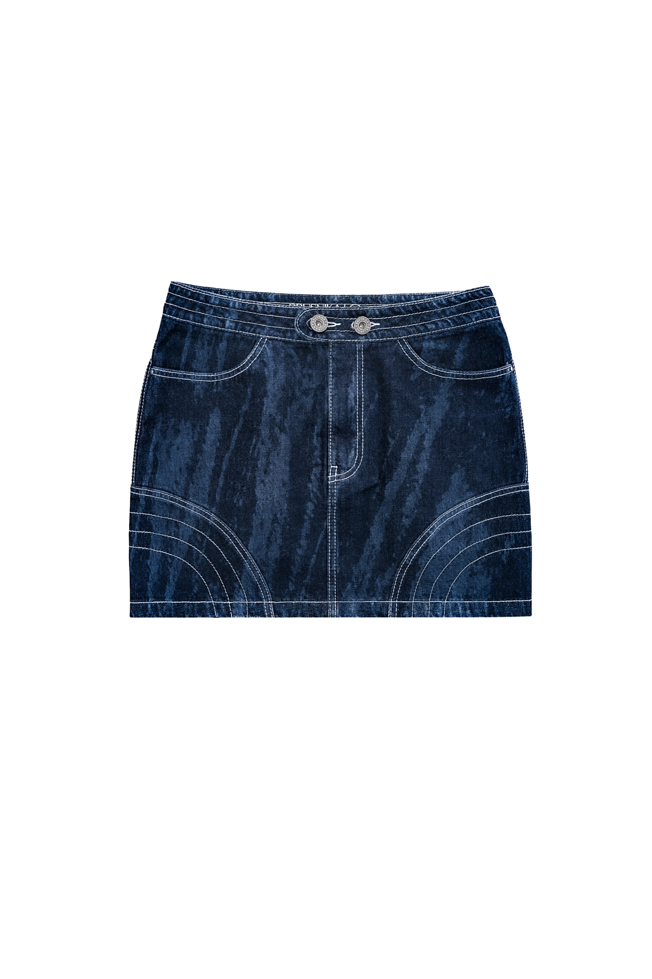 Джинсовая юбка длины мини. Изделие декорировано отстрочкой контрастного цвета, формирующей графические акценты. Застежка на молнию и пуговицу. Без подкладки.