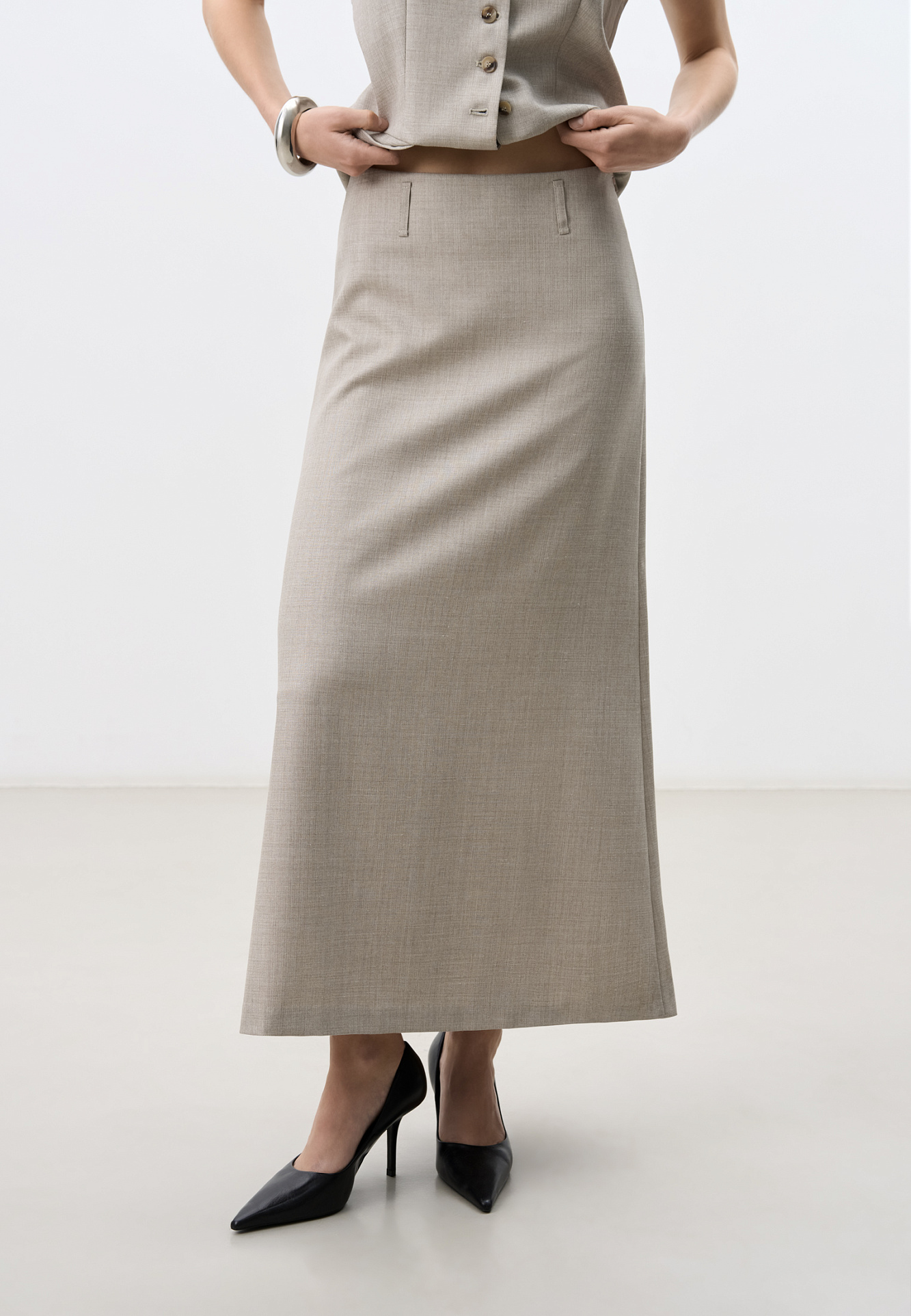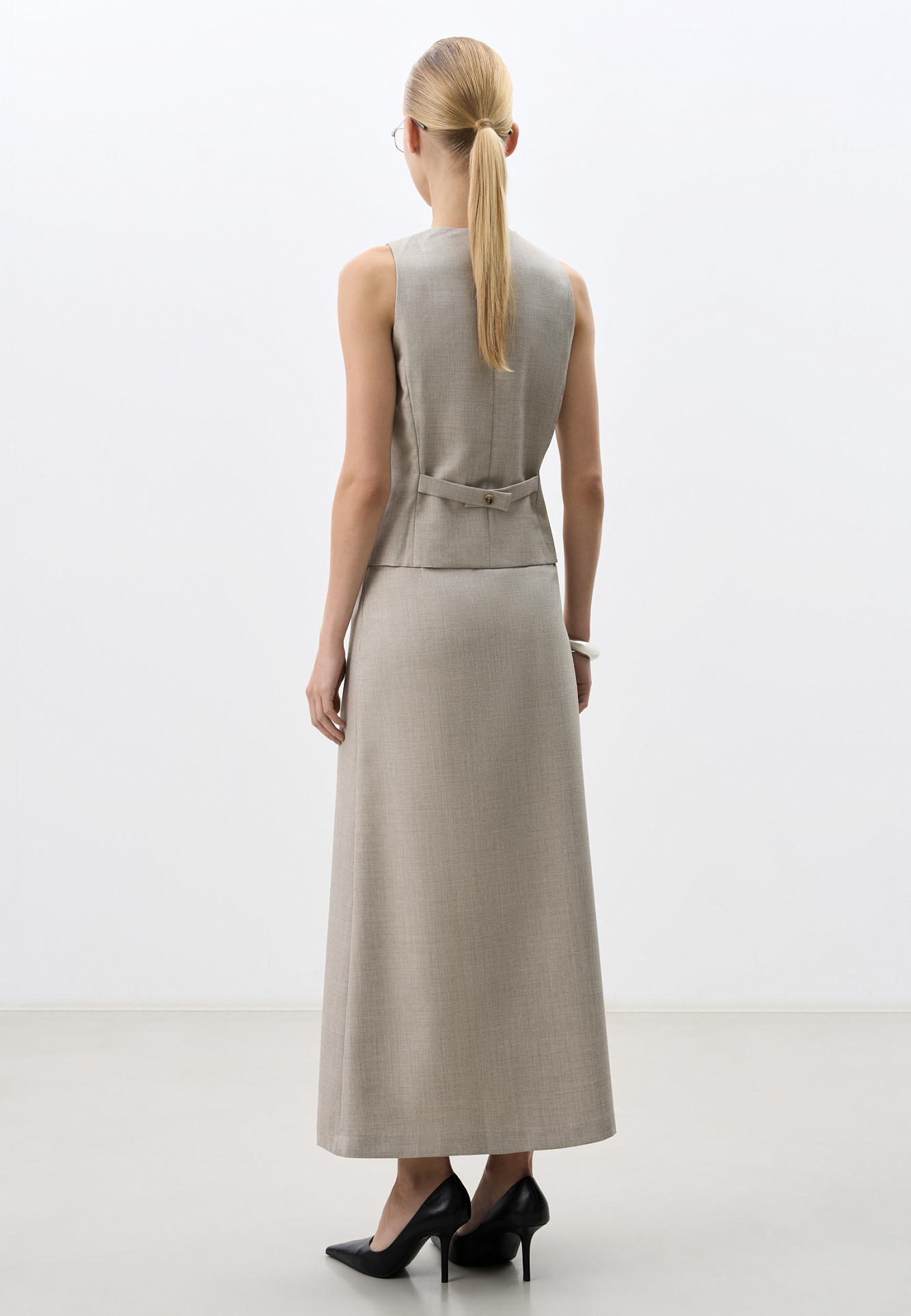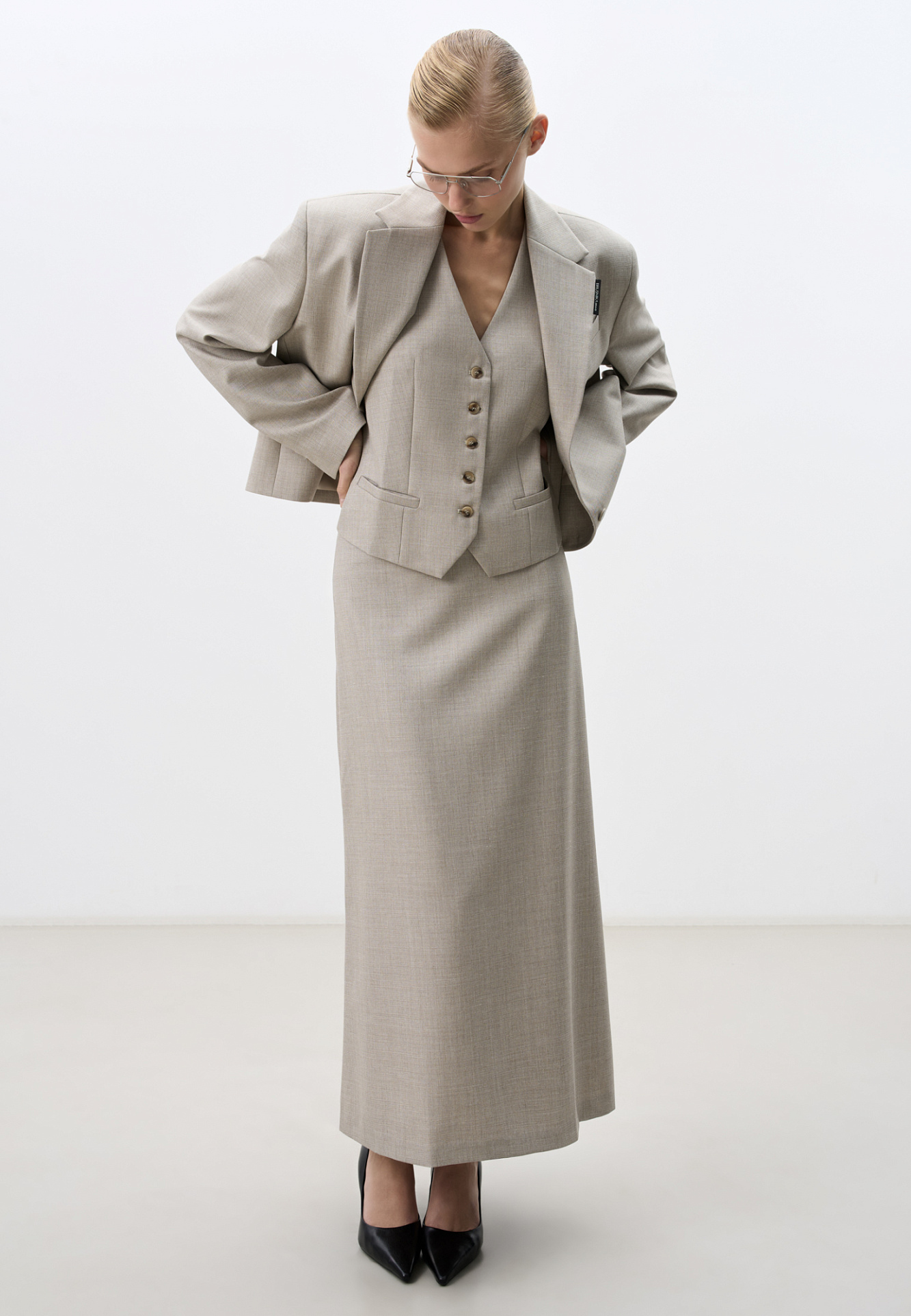 Юбка длины макси из шерсти. Модель А-силуэта со шлевками для ремня и застежкой на молнию сбоку. Дополнить образ можно жилетом и жакетом.