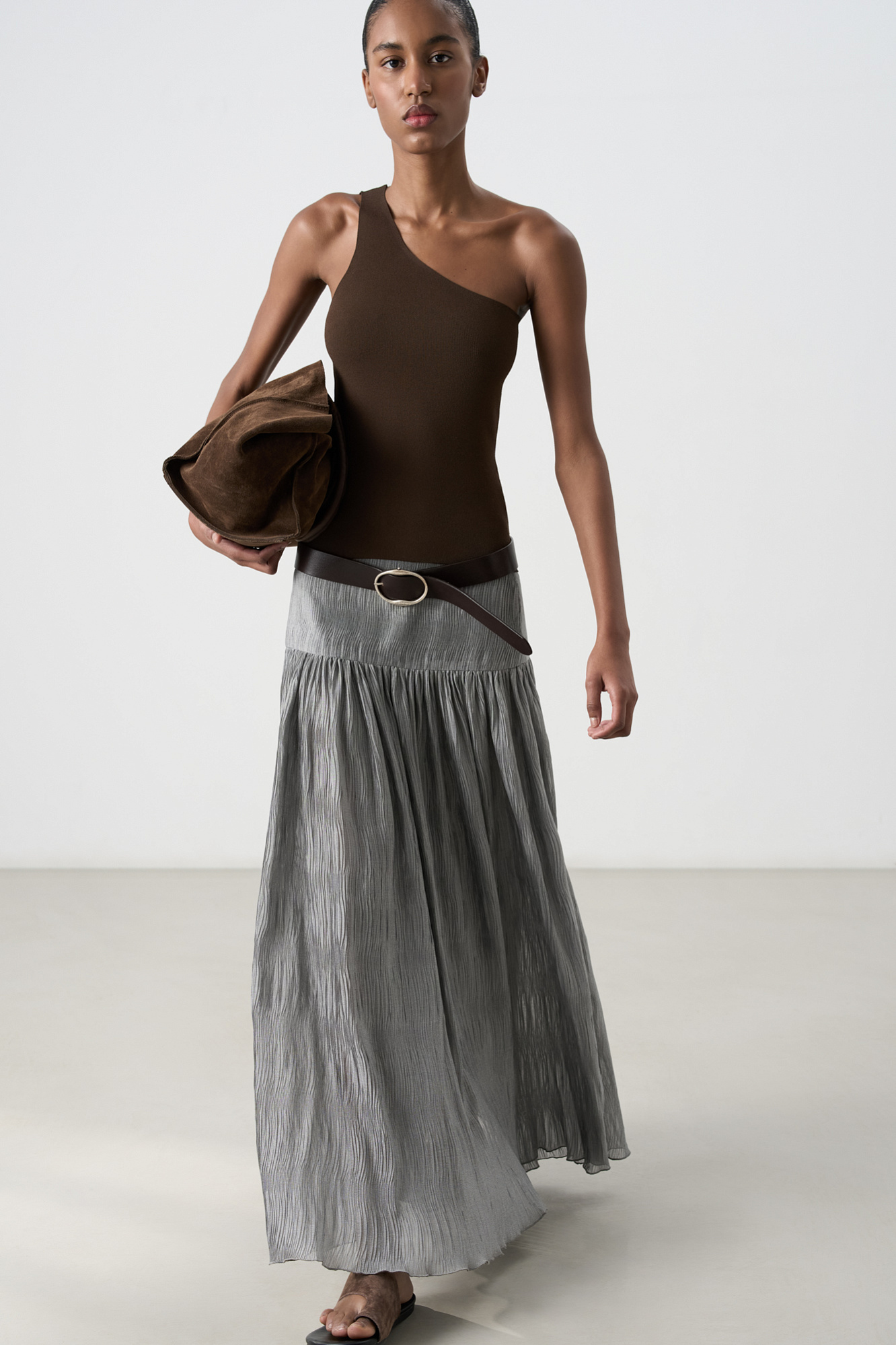 Шифоновая юбка длины макси из текстурированной ткани. Модель приталенного силуэта на кокетке