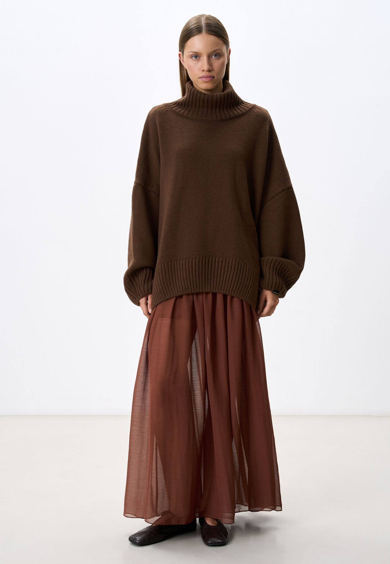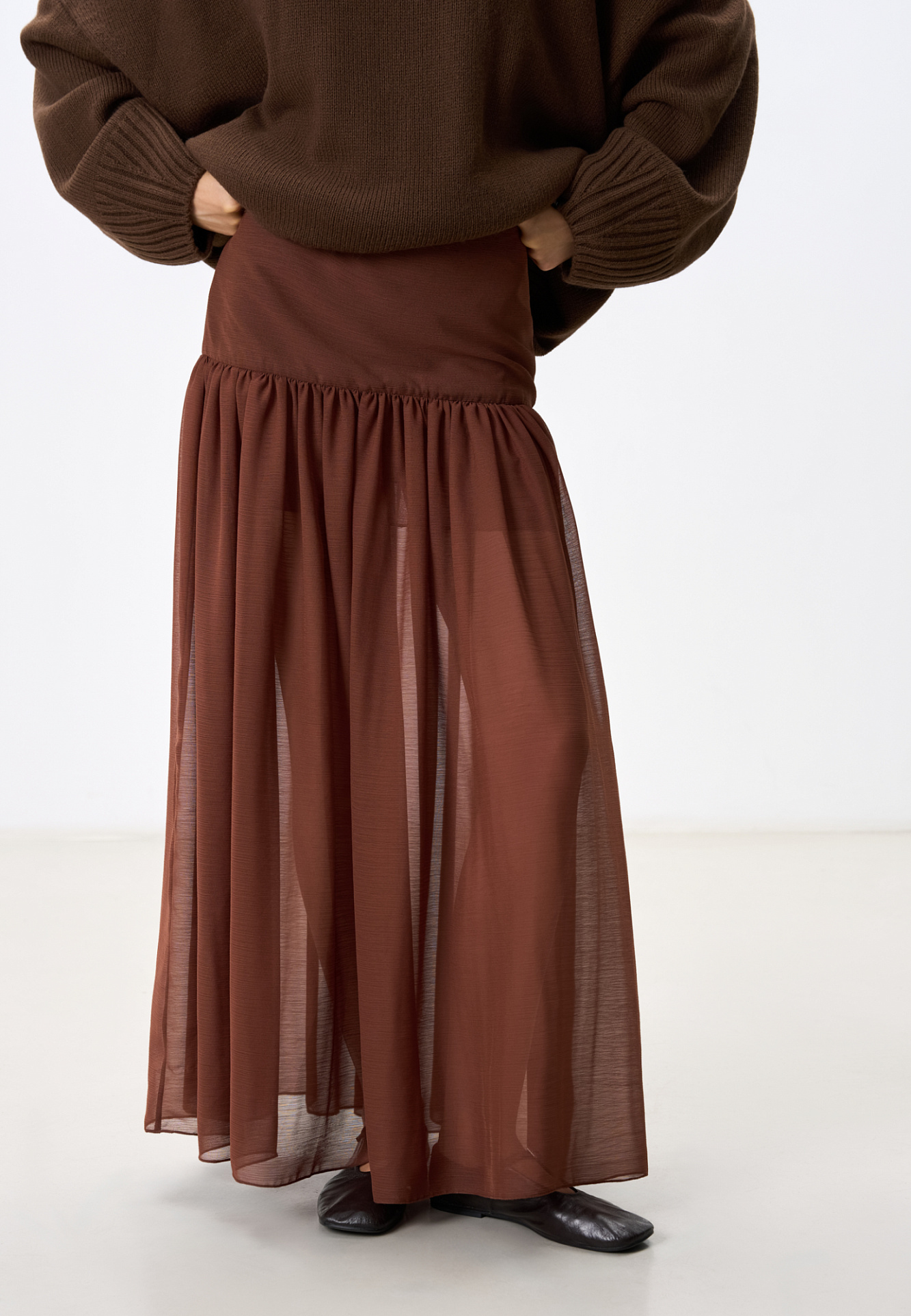 Юбка длины макси из шифоновой ткани. Модель А-силуэта с широкой кокеткой и мягкими складками. Изделие дополнено незаметной застежкой-молнией и миниатюрным крючком.