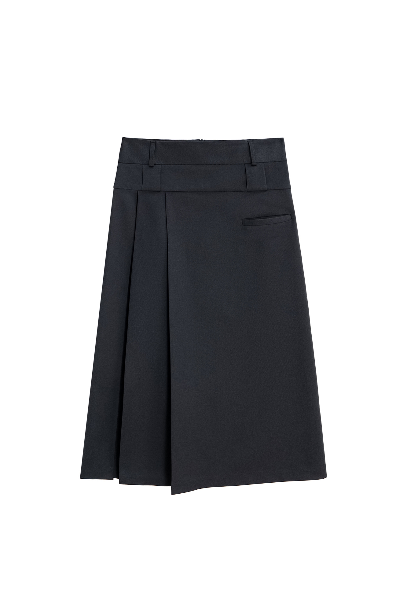 Юбка длины миди из шерсти. Модель прямого кроя, с двумя продольными складками сбоку, двойным поясом со шлевками для ремня, врезным карманом и застежкой на молнию. Изделие без подкладки.