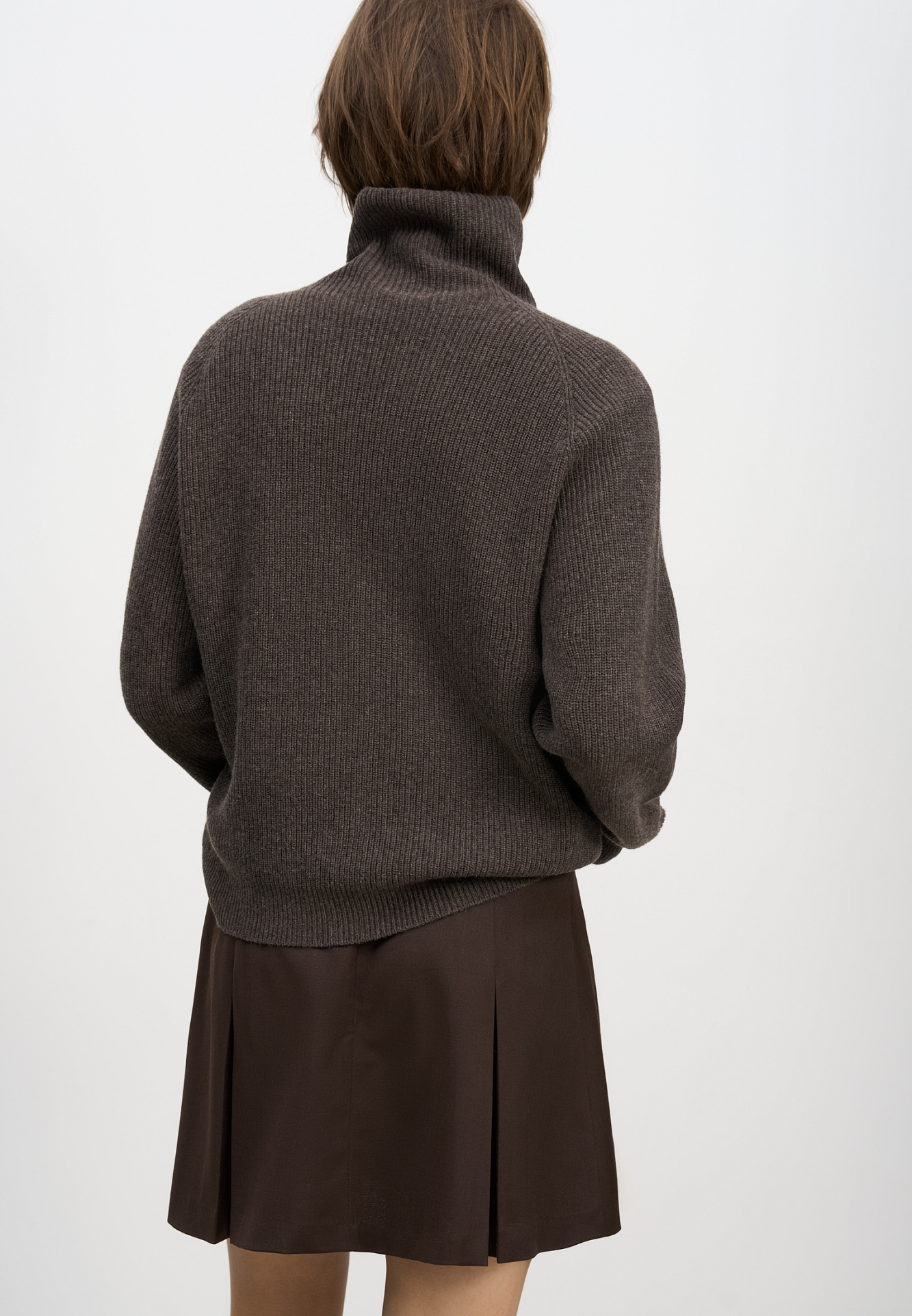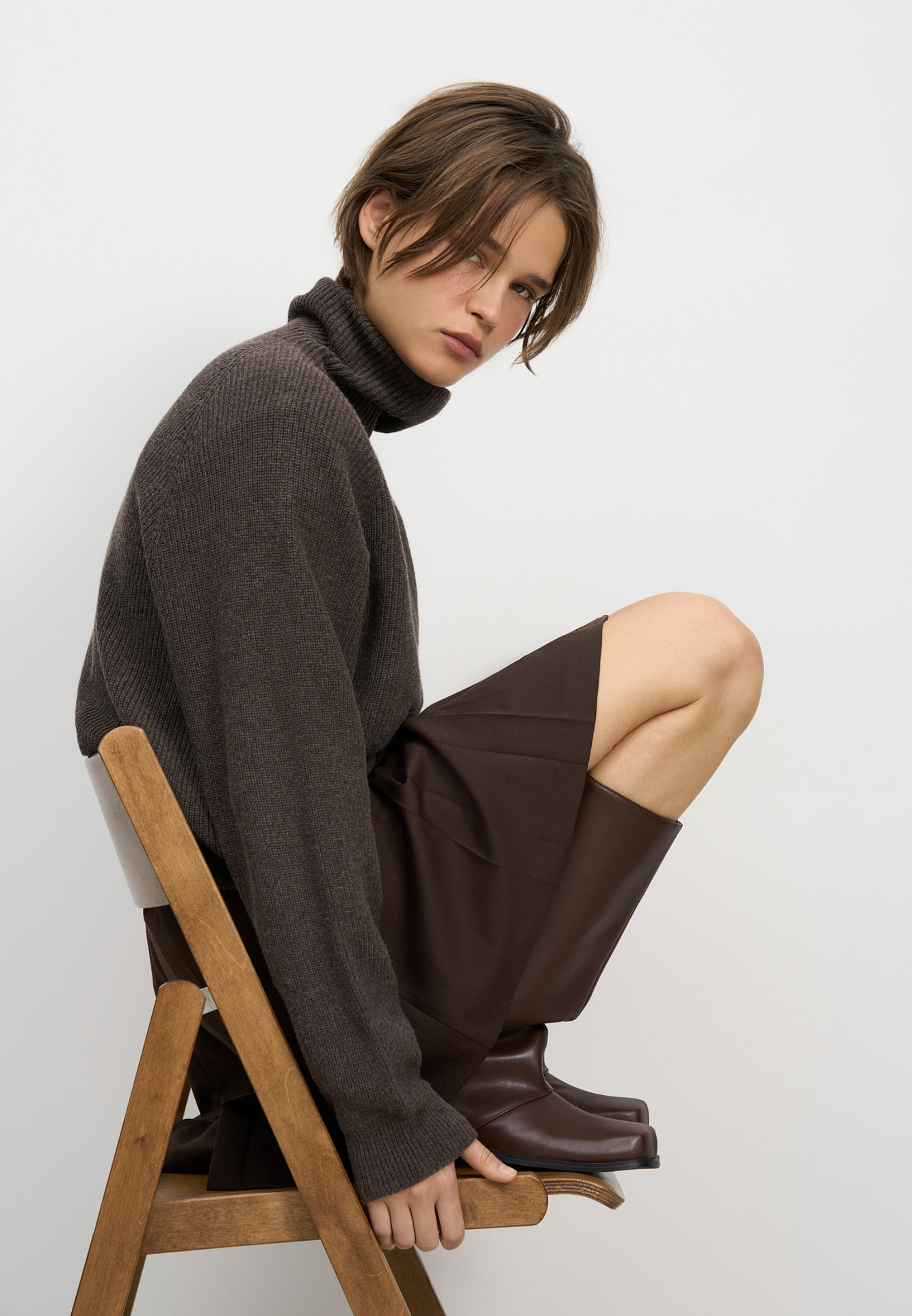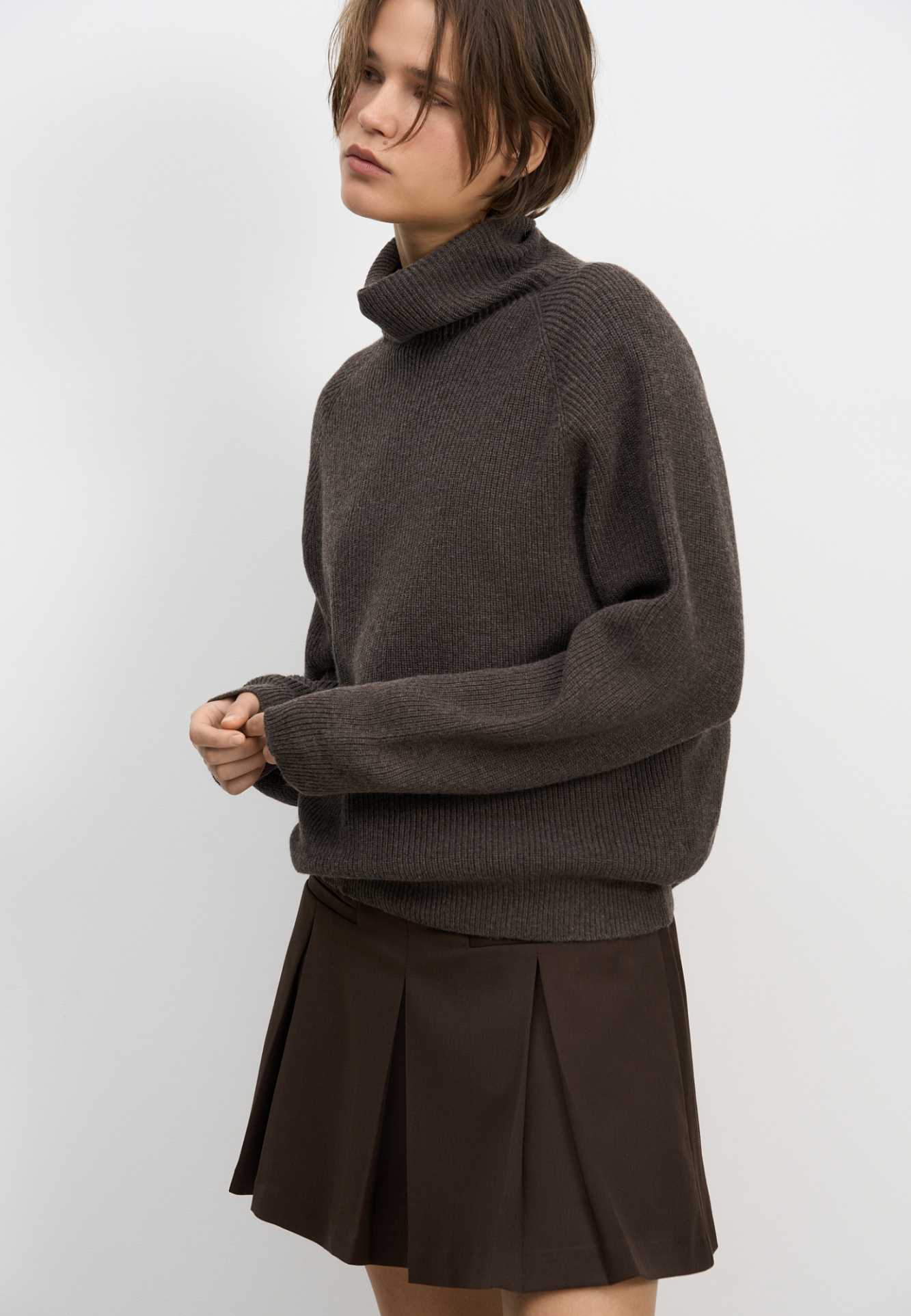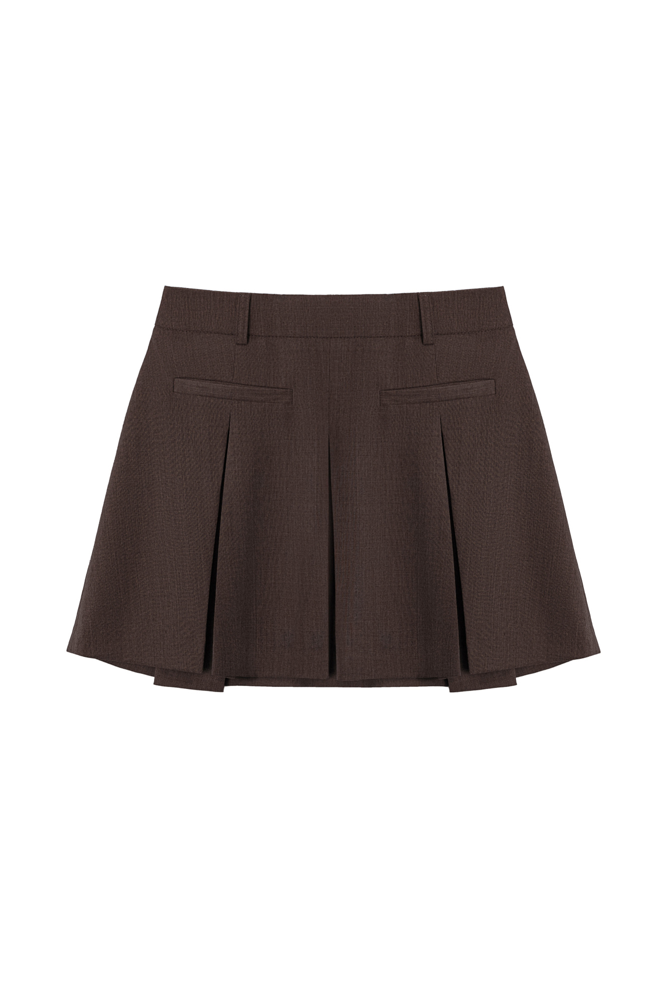 Юбка длины мини из шерсти. Модель прямого кроя, с крупными складками, поясом со шлевками для ремня, врезными карманами спереди и застежкой на молнию. Изделие без подкладки.