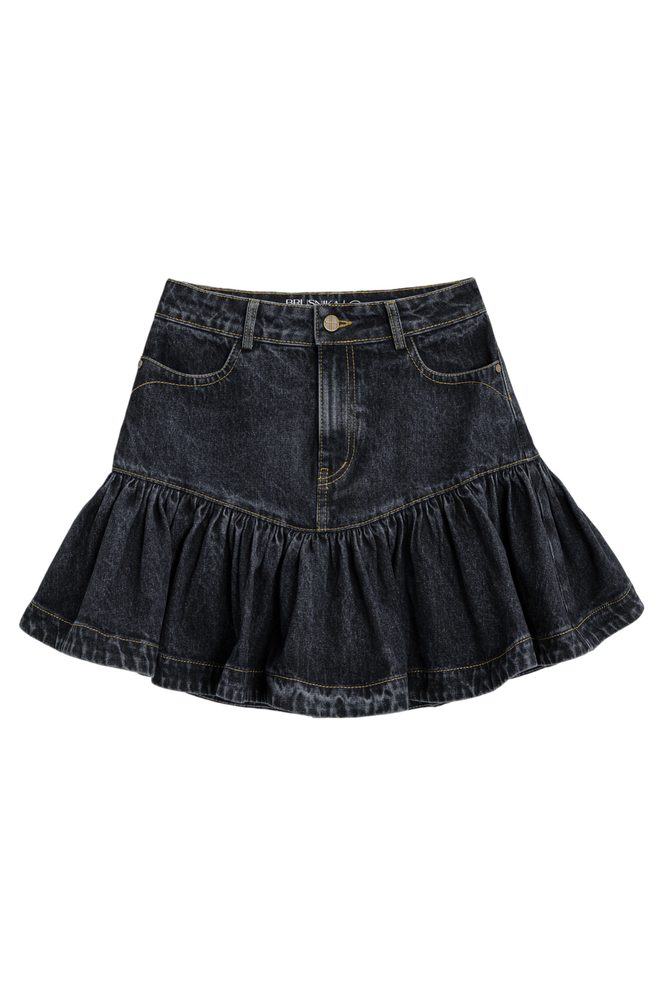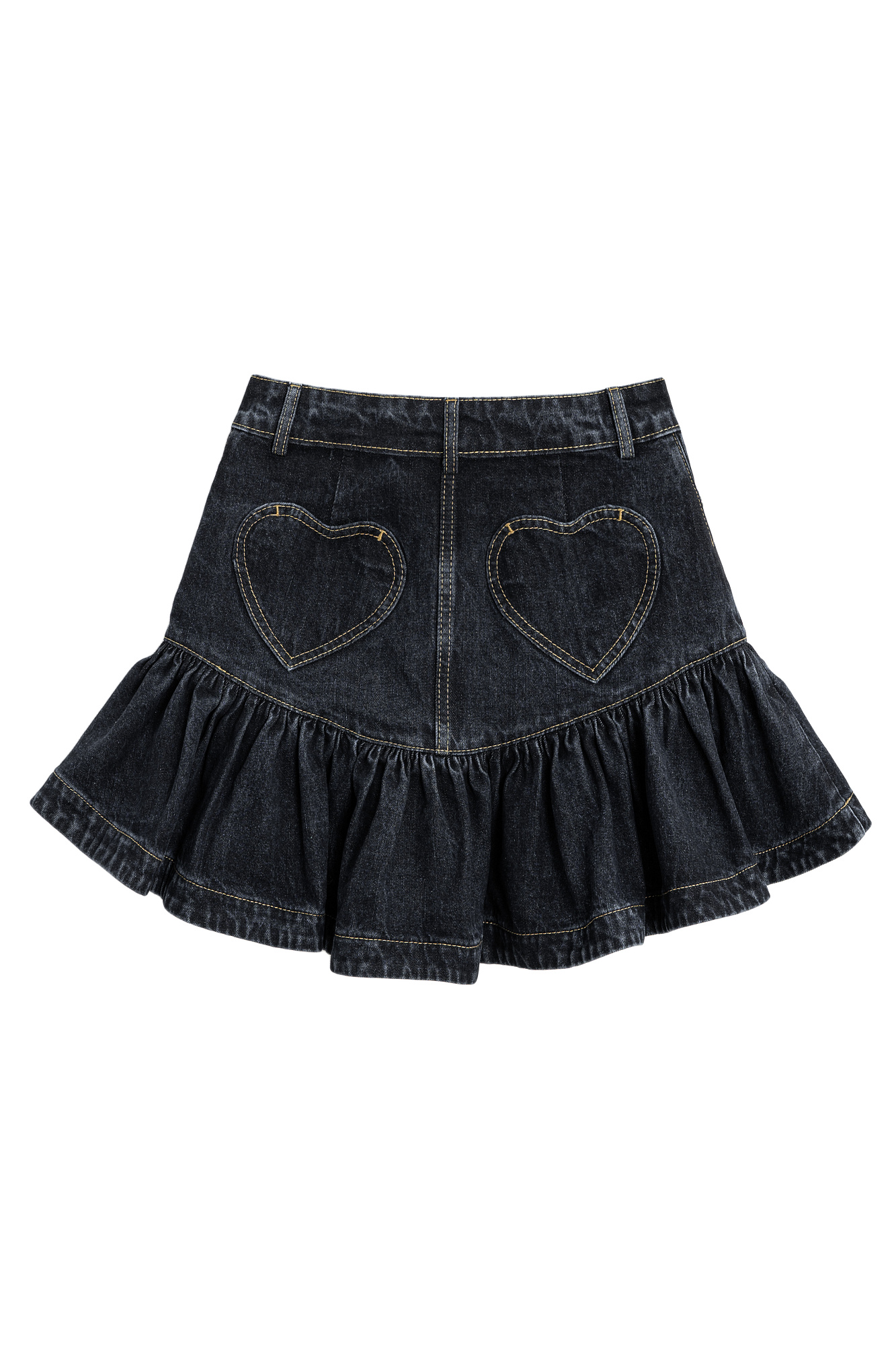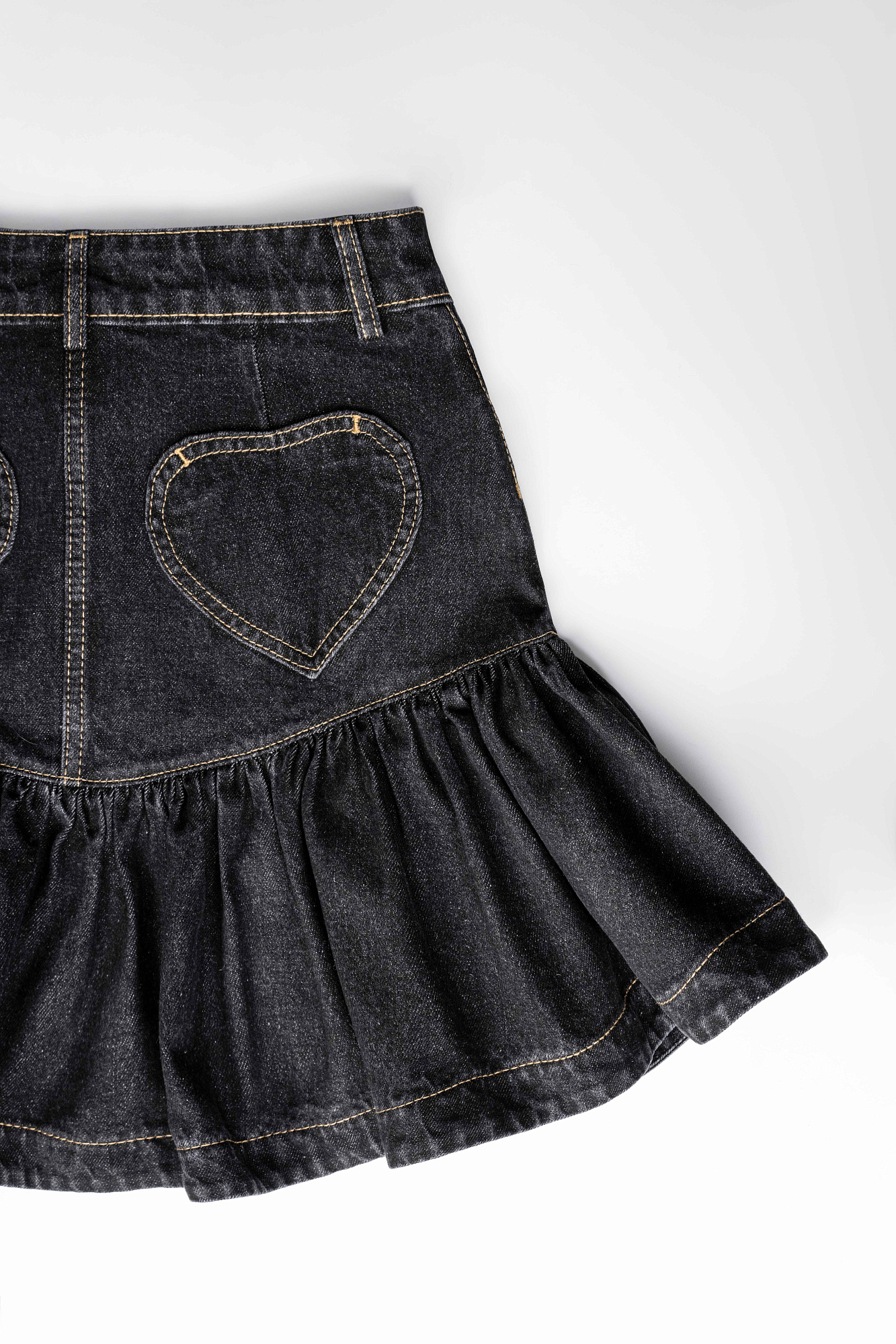 Джинсовая юбка длины мини на кокетке. Модель с рельефными швами, строчкой контрастного цвета, брендированными заклепками под карманами и шлевками на поясе для ремня. Задние карманы выполнены в виде сердечек. Застежка на молнию и пуговицу.