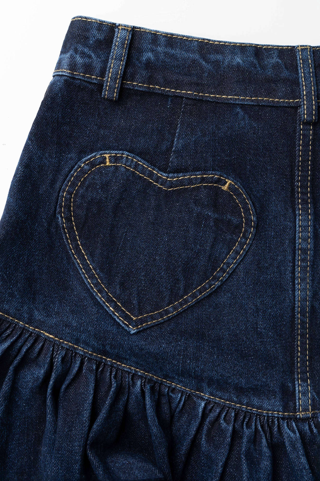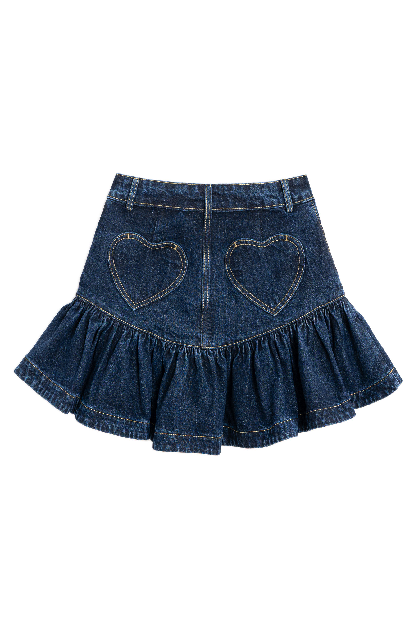 Джинсовая юбка длины мини на кокетке. Модель с рельефными швами, строчкой контрастного цвета, брендированными заклепками под карманами и шлевками на поясе для ремня. Задние карманы выполнены в виде сердечек. Застежка на молнию и пуговицу.